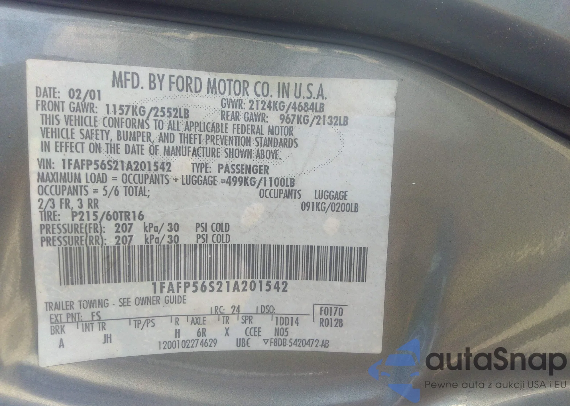 • VIN 1FAFP56S21A201542