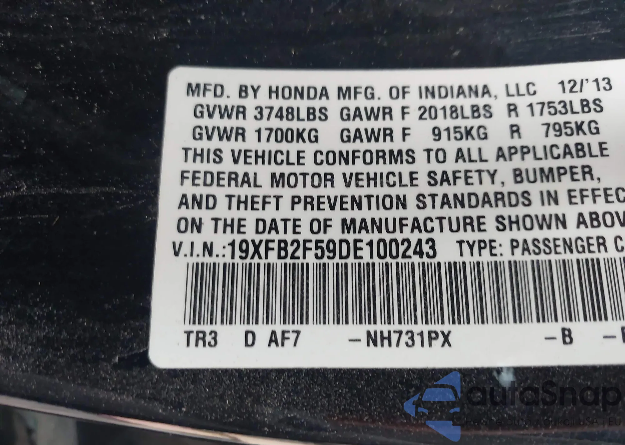 • VIN 19XFB2F59DE100243