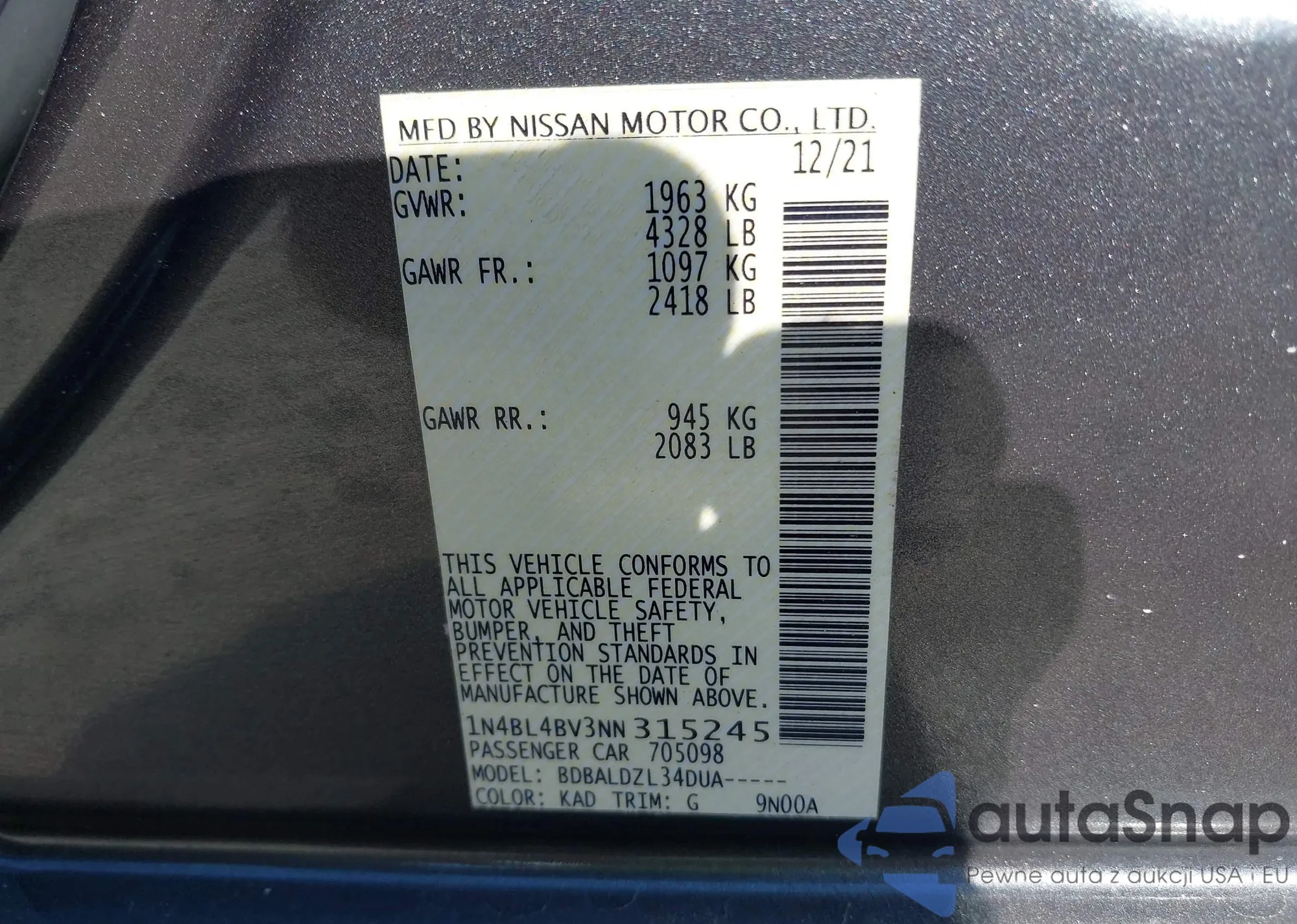 • VIN 1N4BL4BV3NN315245