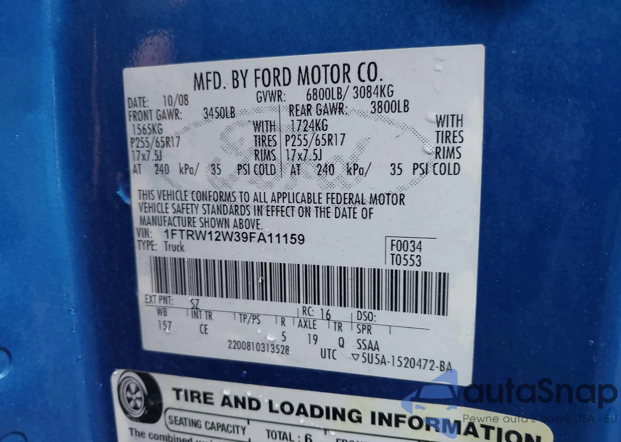 • VIN 1FTRW12W39FA11159