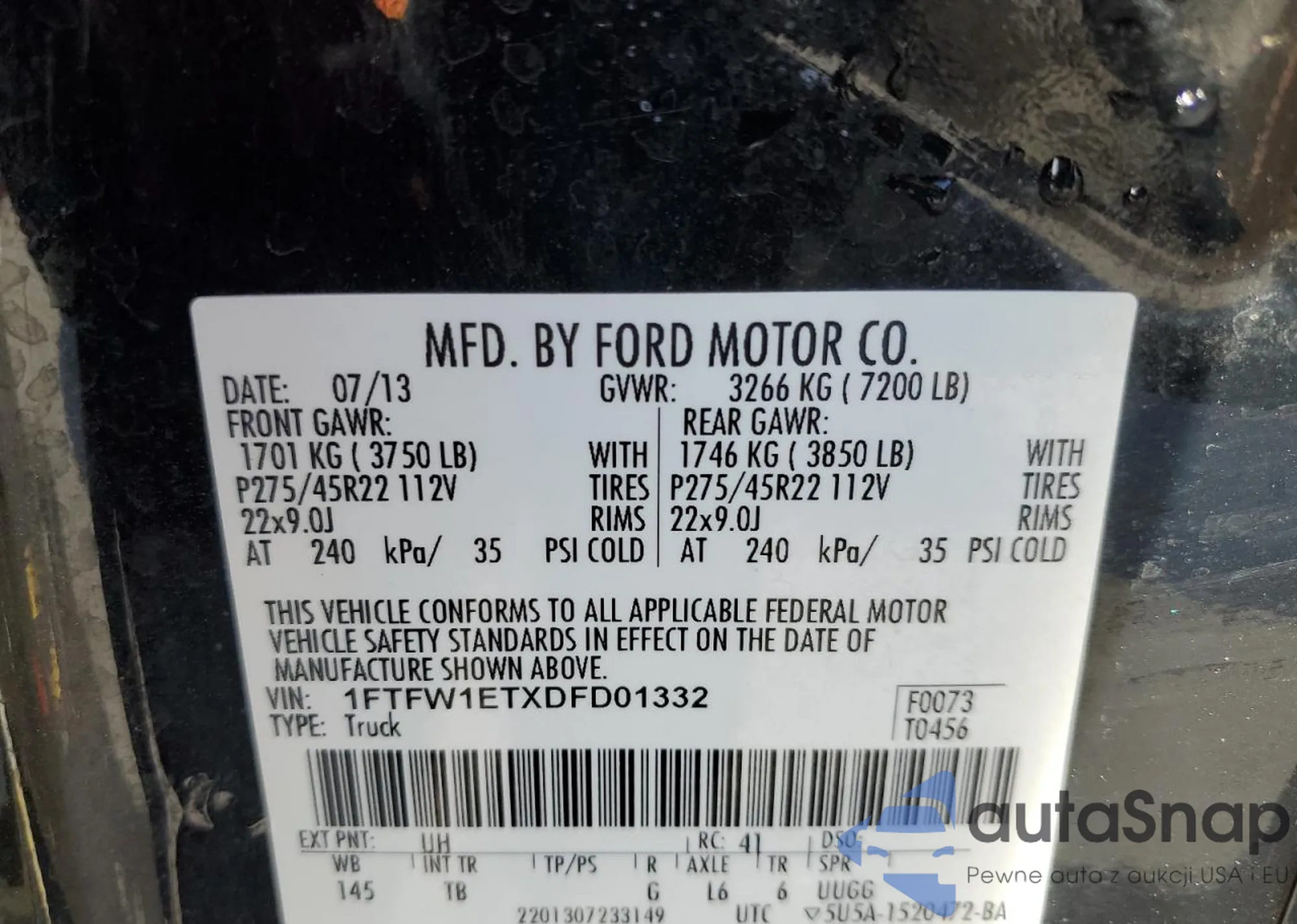 • VIN 1FTFW1ETXDFD01332