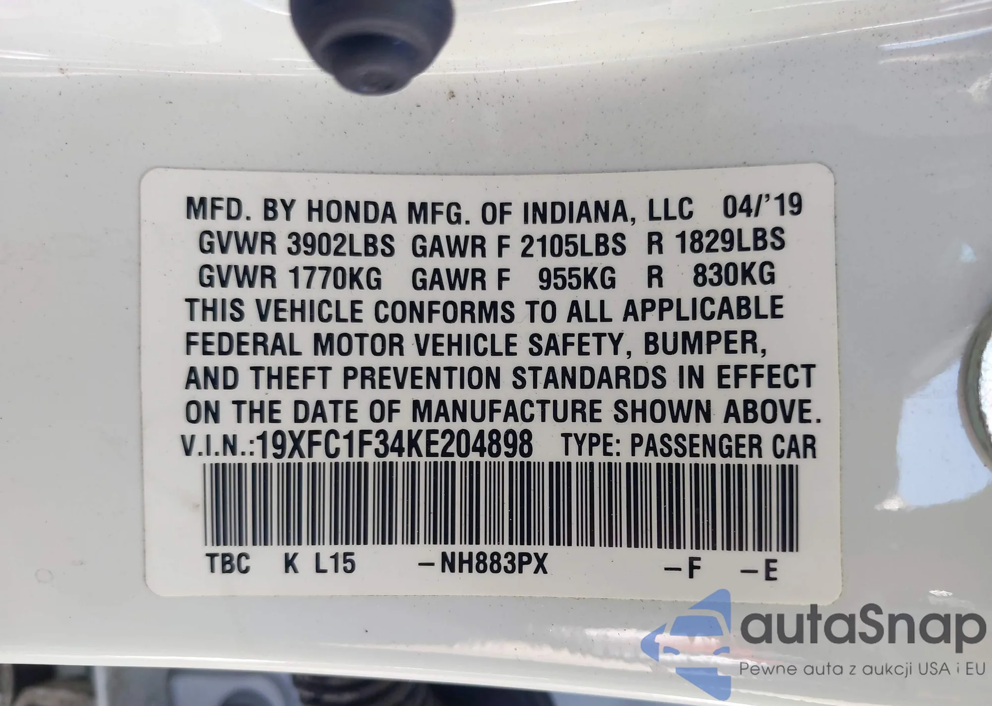 LOT: 40442109 VIN: 19XFC2F80KE022214