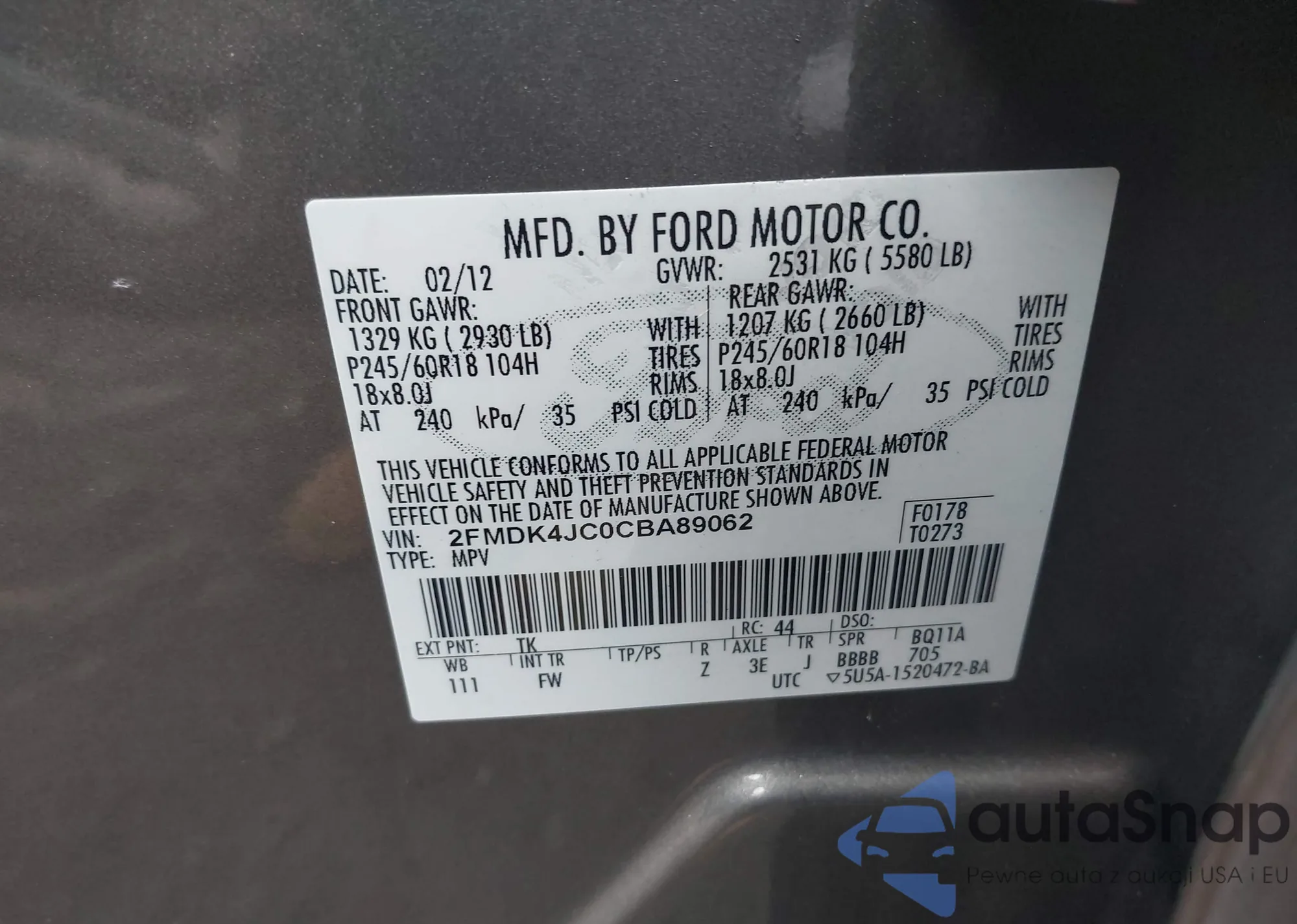 LOT: 40952807 VIN: 2FMDK4JC0CBA89062
