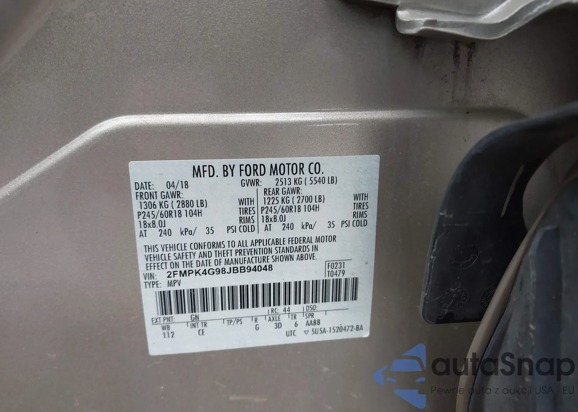 LOT: 40906043 VIN: 2FMPK4G98JBB94048