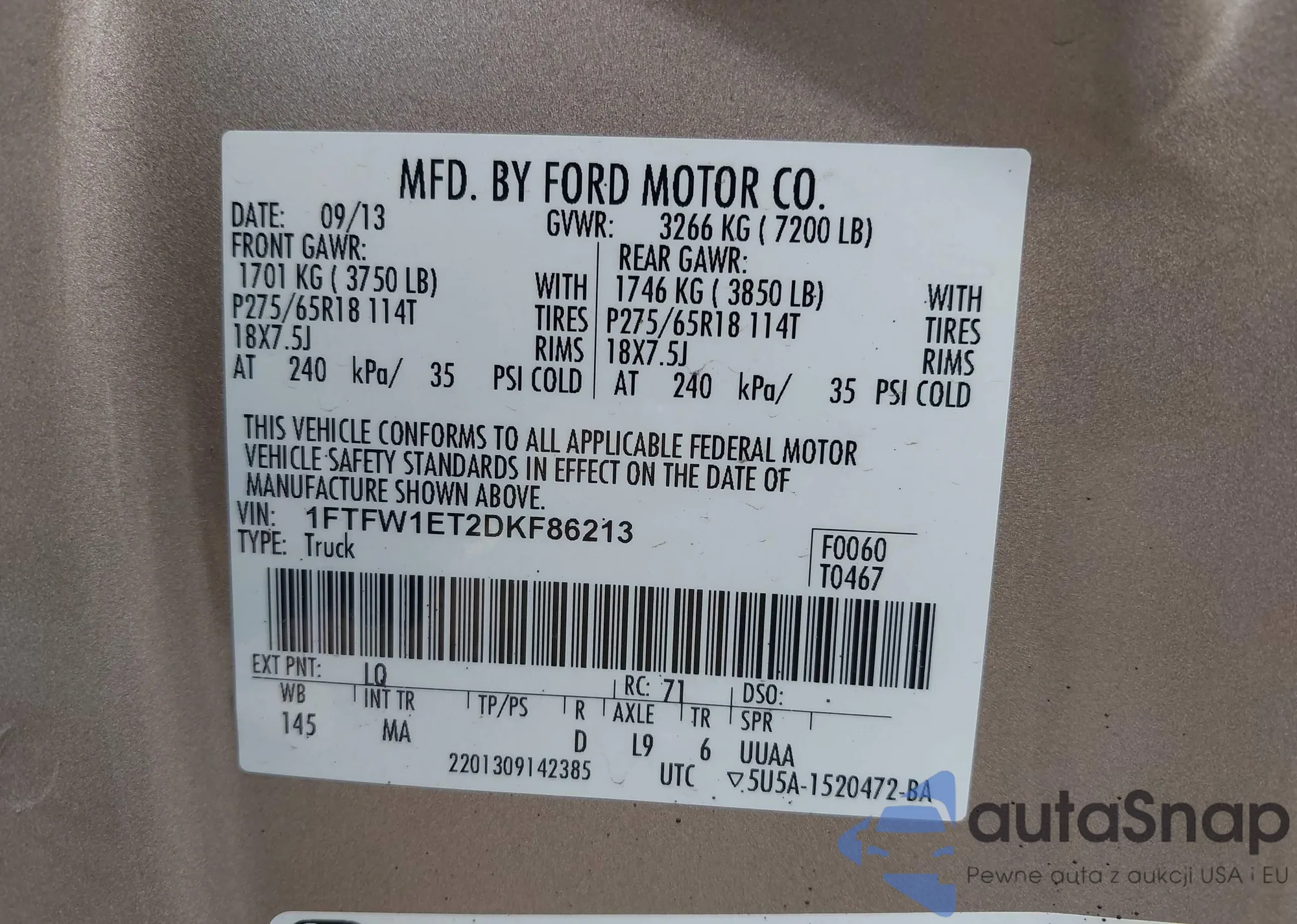 • VIN 1FTFW1ET2DKF86213