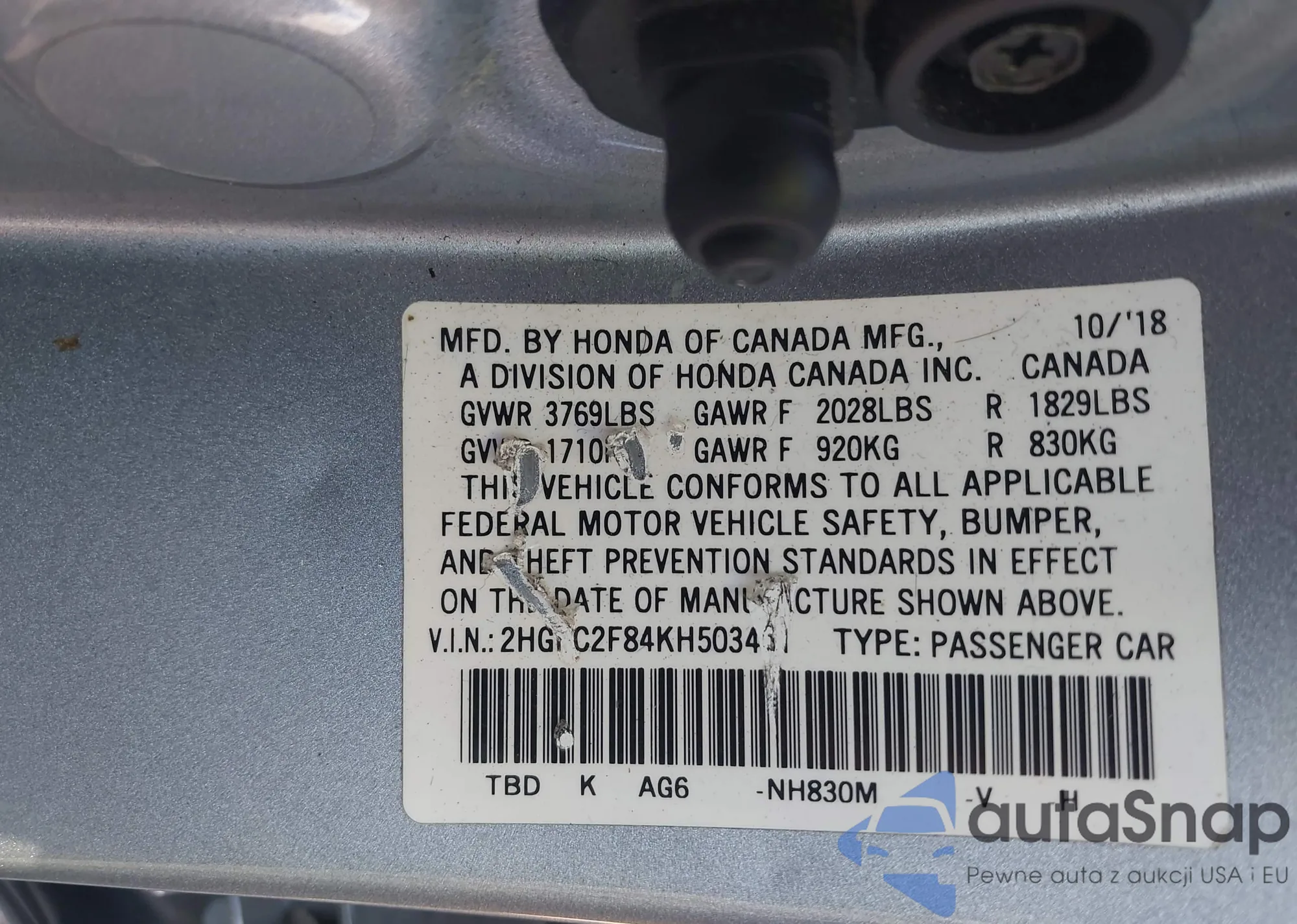 • VIN 2HGFC2F84KH503461