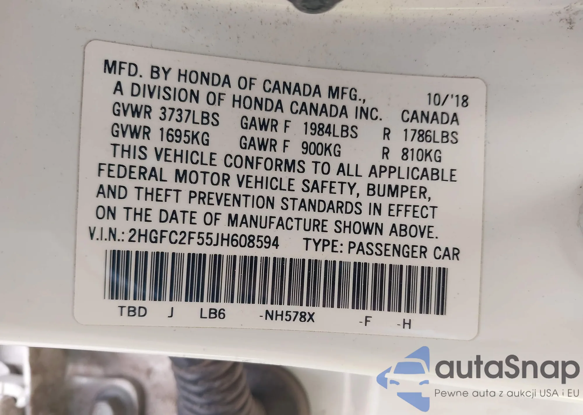 • VIN 2HGFC2F55JH608594