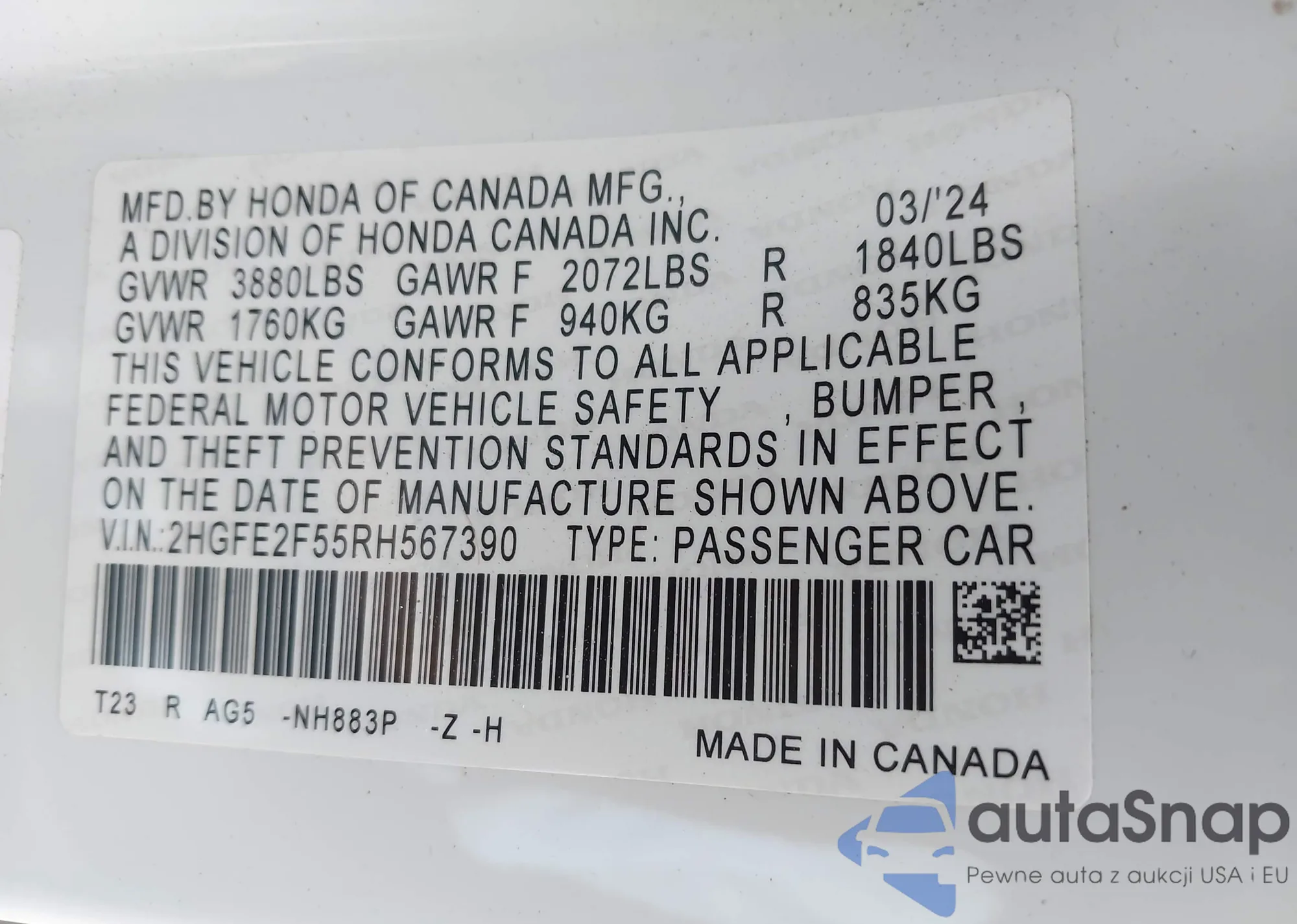 LOT: 40890567 VIN: 2HGFE2F50PH503593
