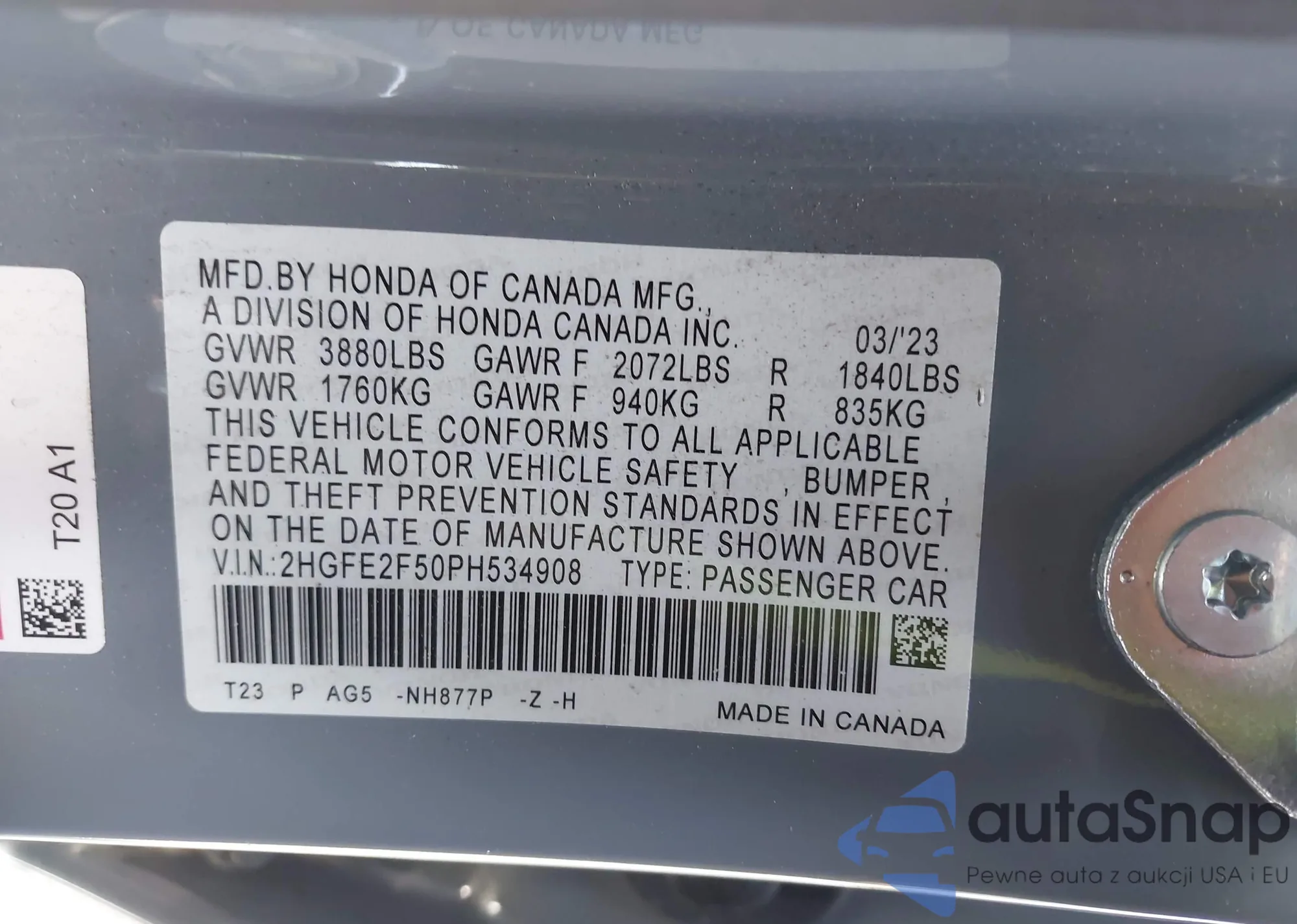• VIN 2HGFE2F50PH534908