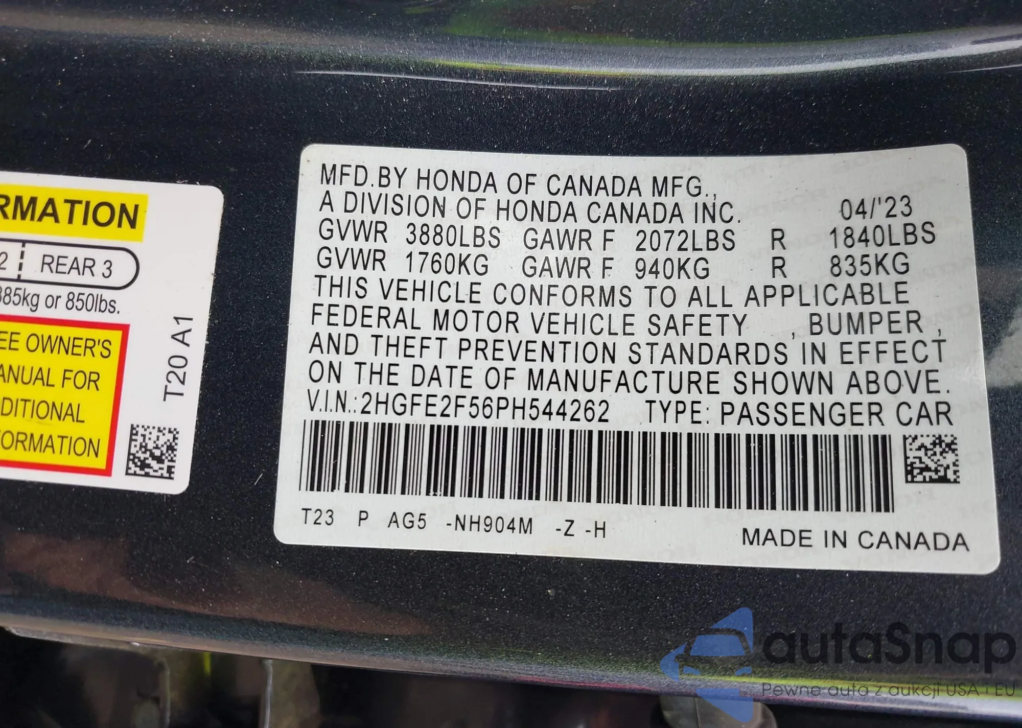 • VIN 2HGFE2F56PH544262
