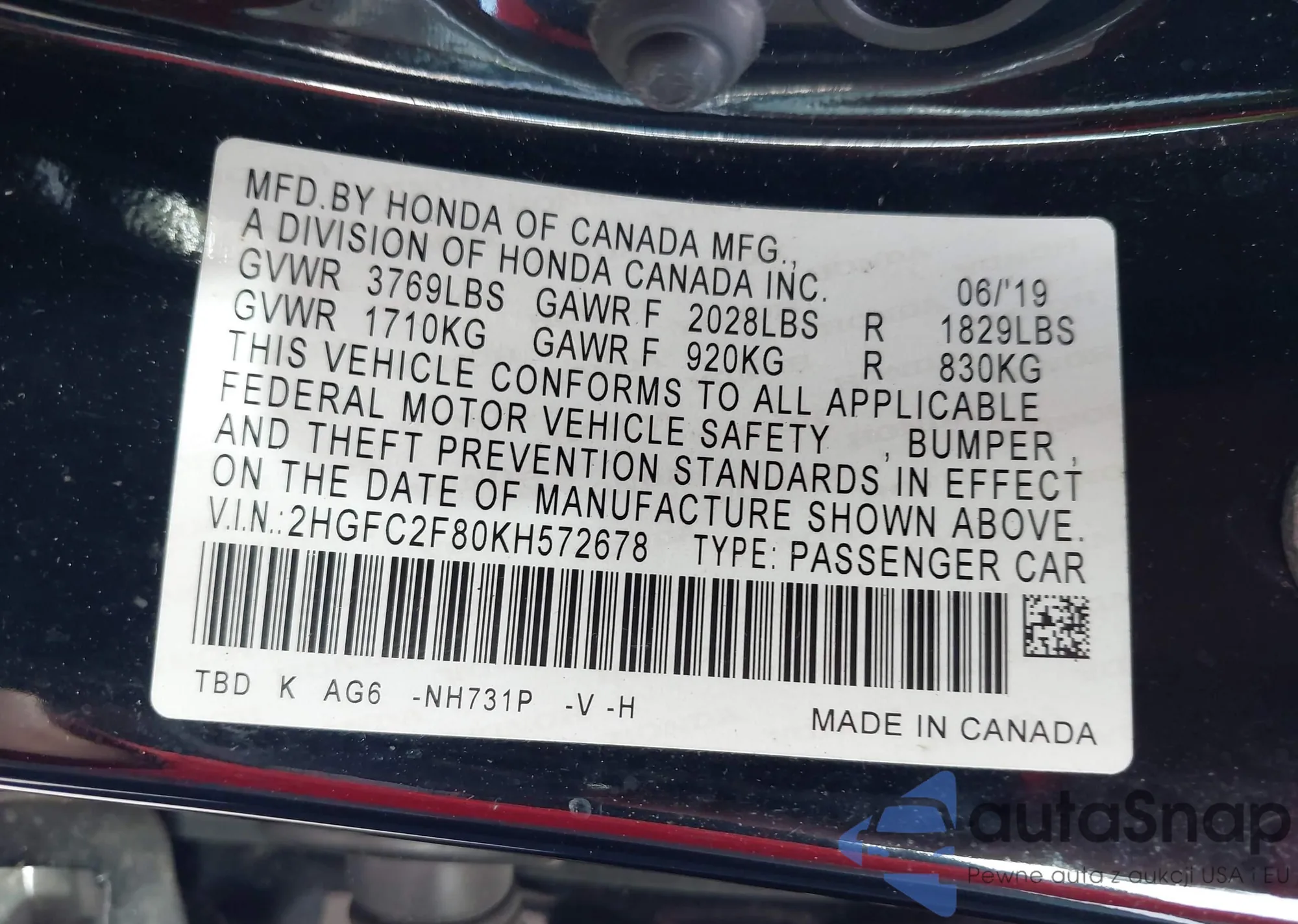 • VIN 2HGFC2F80KH572678