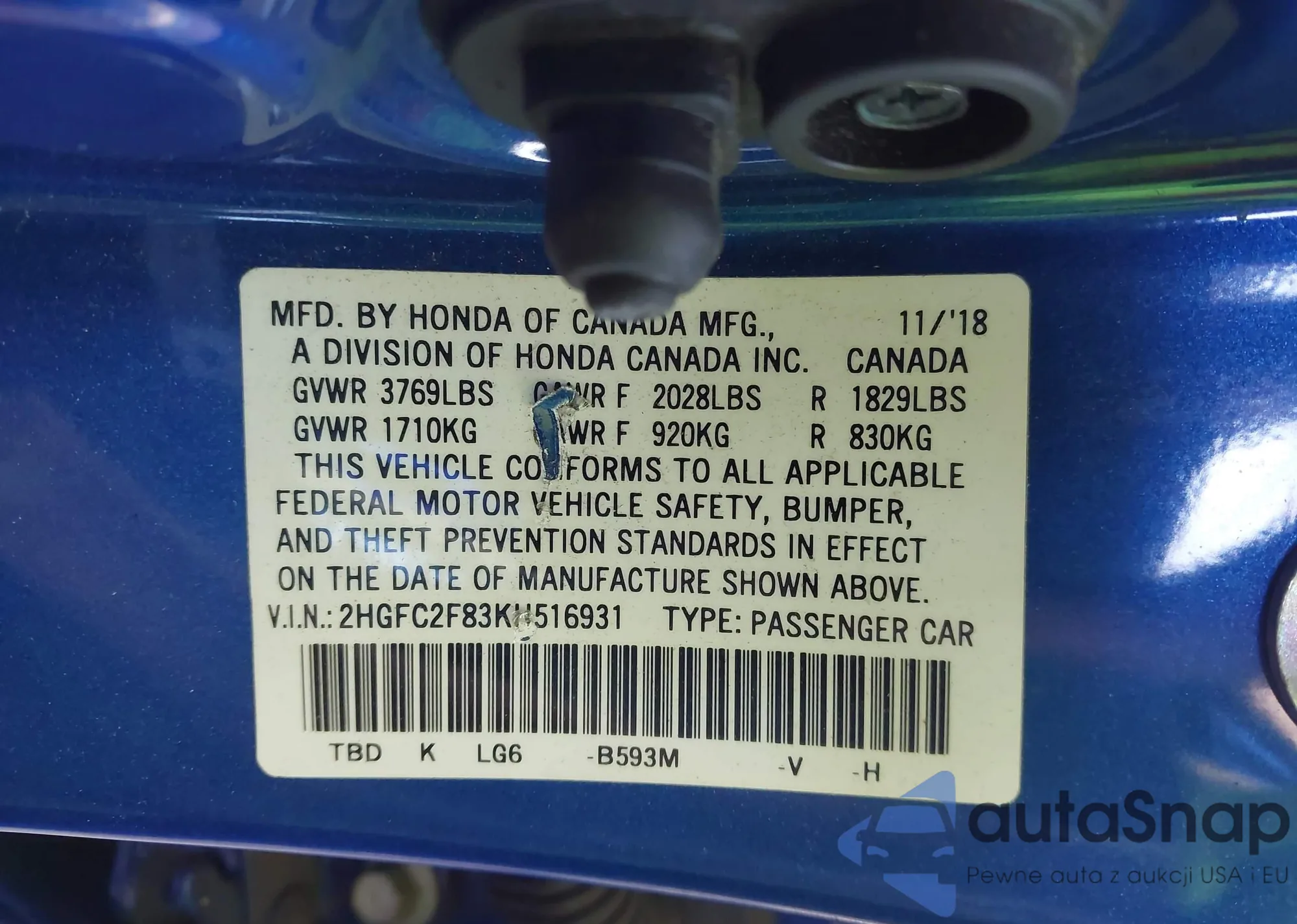 • VIN 2HGFC2F83KH516931