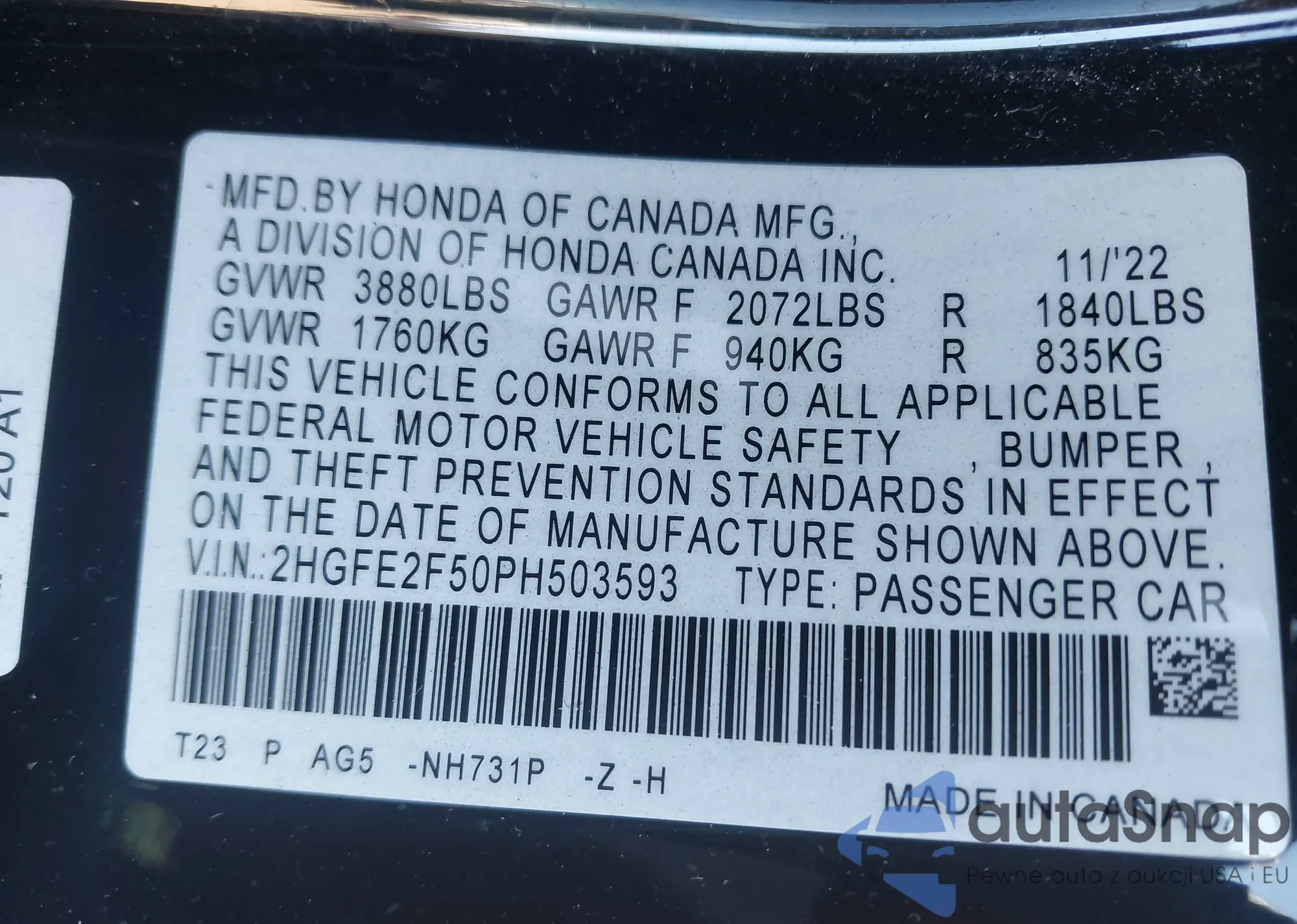 • VIN 2HGFE2F50PH503593
