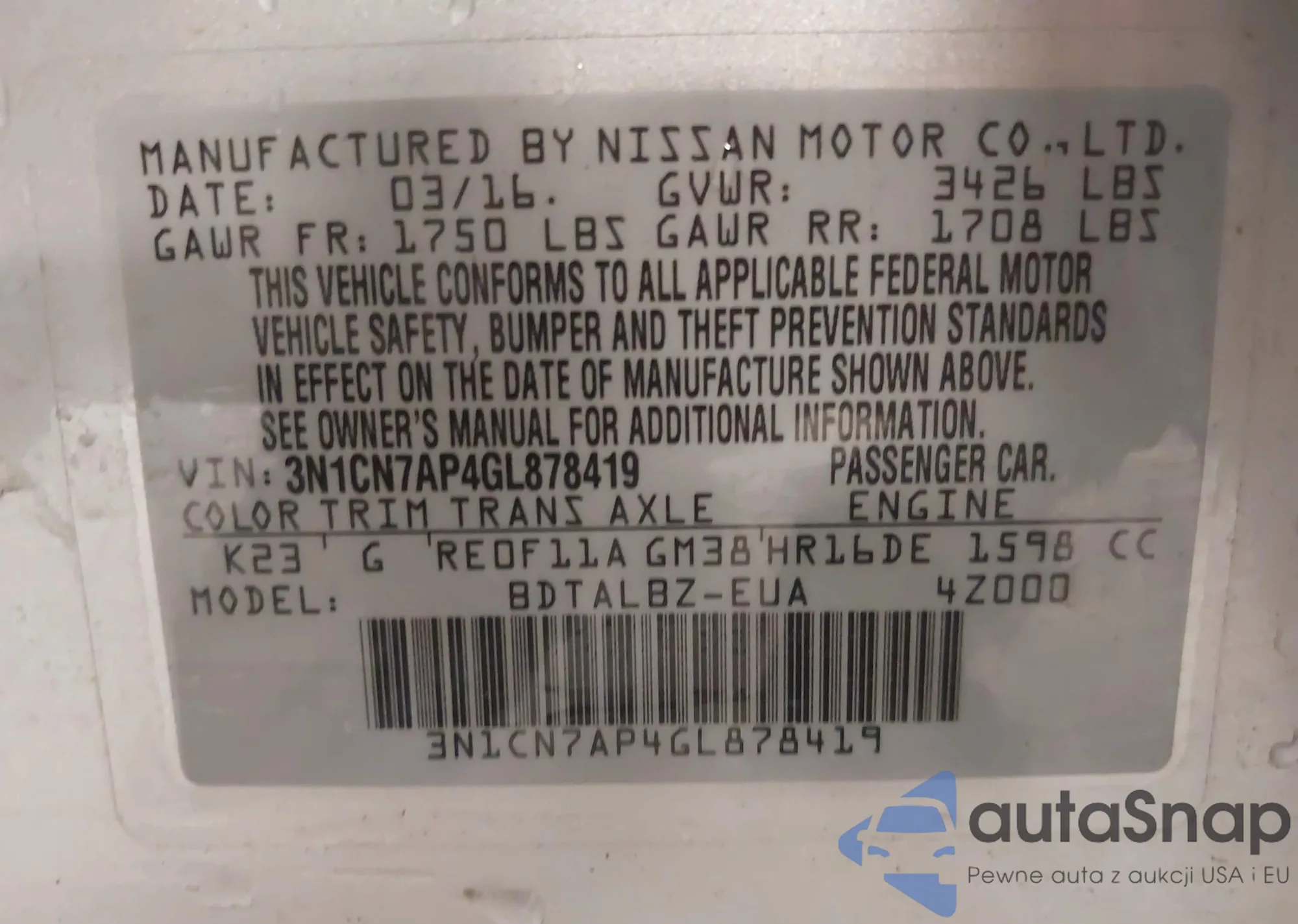 • VIN 3N1CN7AP4GL878419