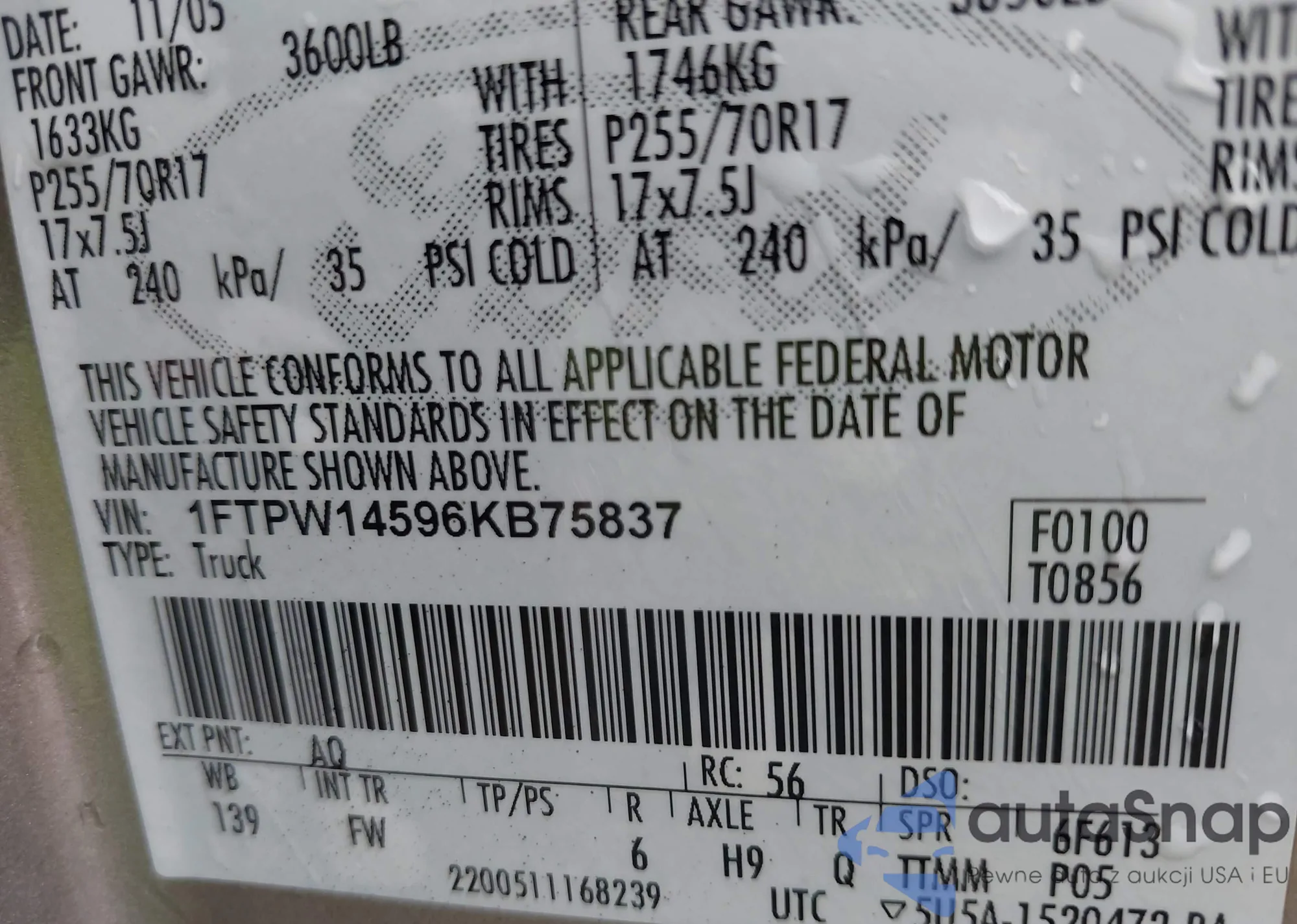 LOT: 38660268 VIN: 1FTPW14596KB75837