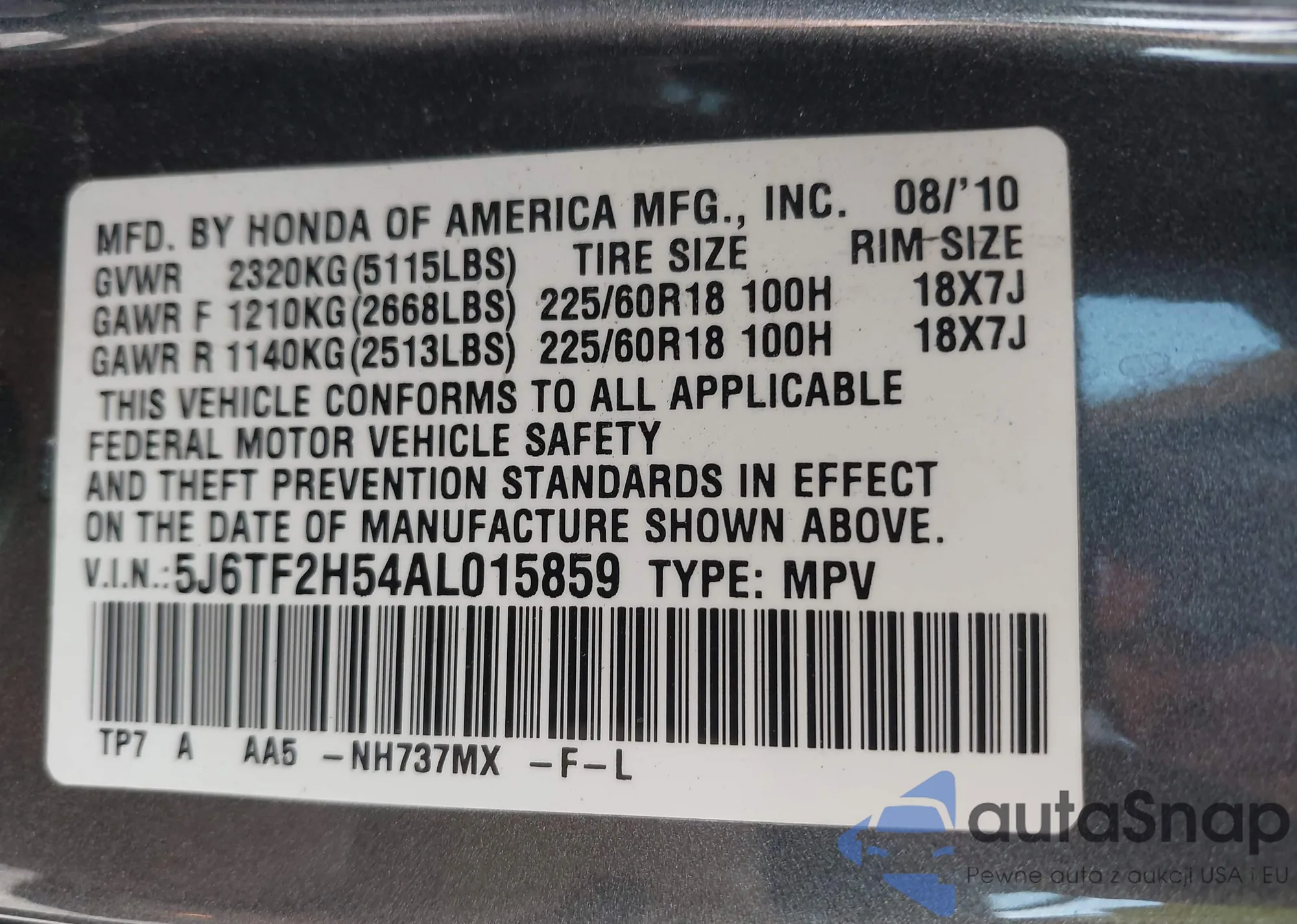 • VIN 5J6TF2H54AL015859