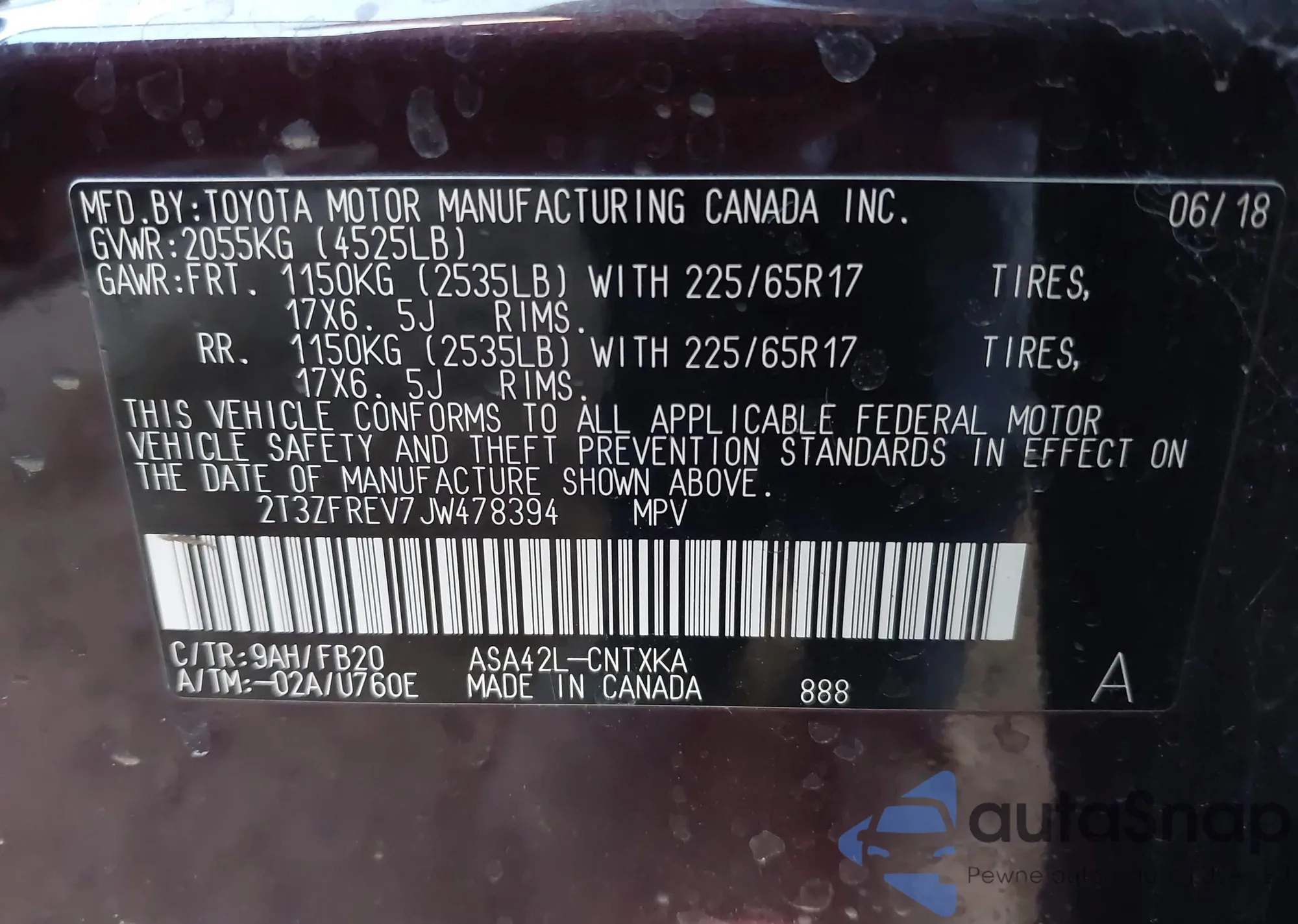 • VIN 2T3ZFREV7JW478394