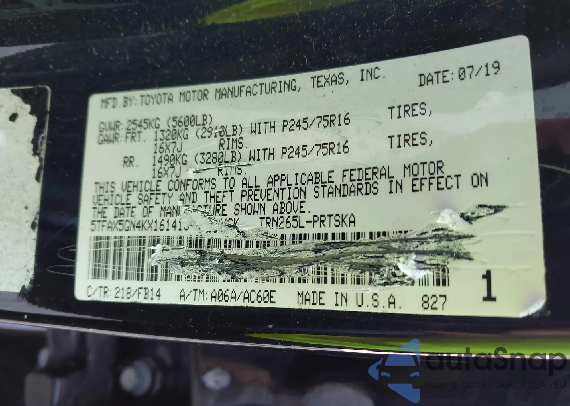• VIN 5TFAX5GN4KX161413