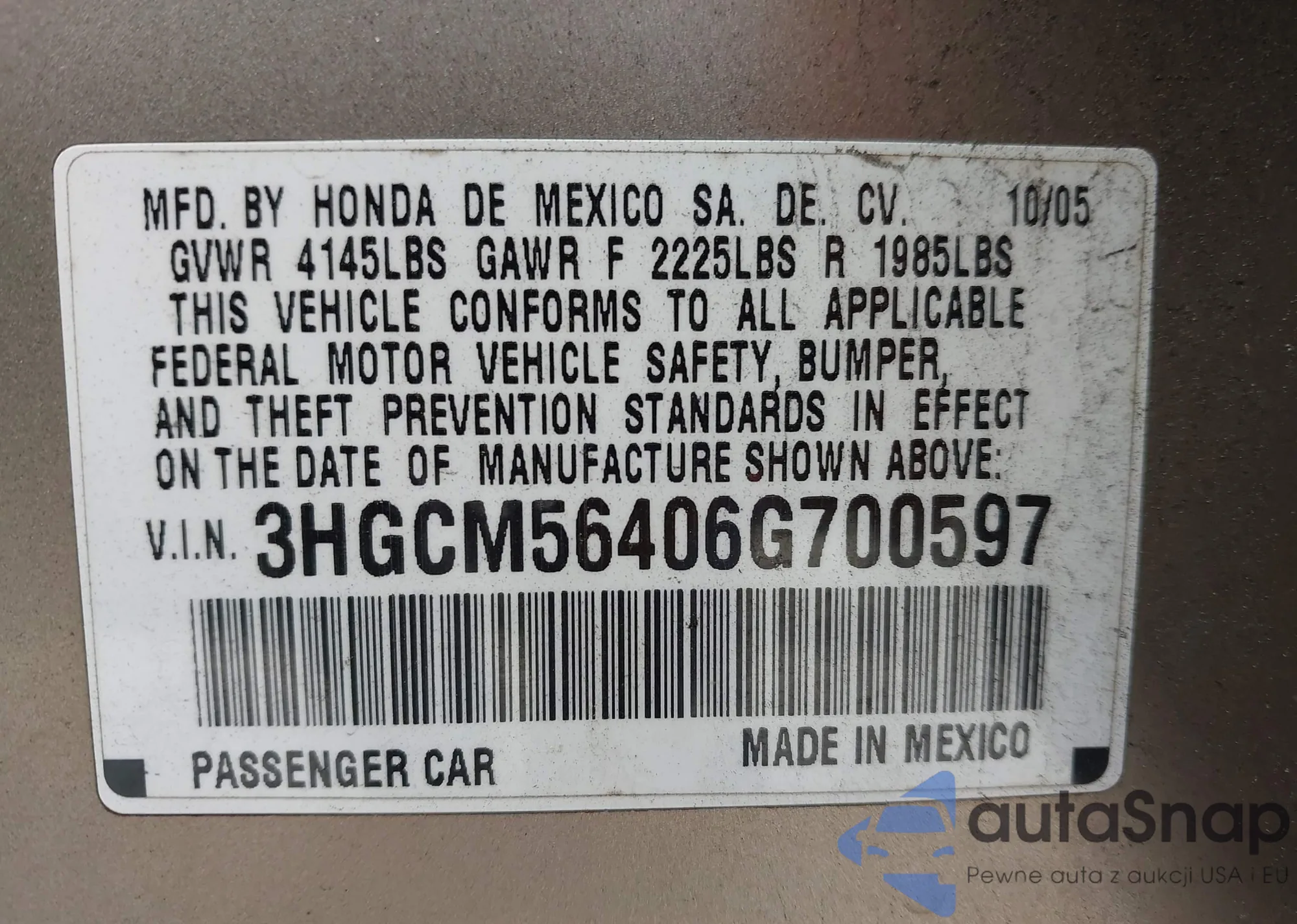 LOT: 41063423 VIN: 3HGCM56406G700597
