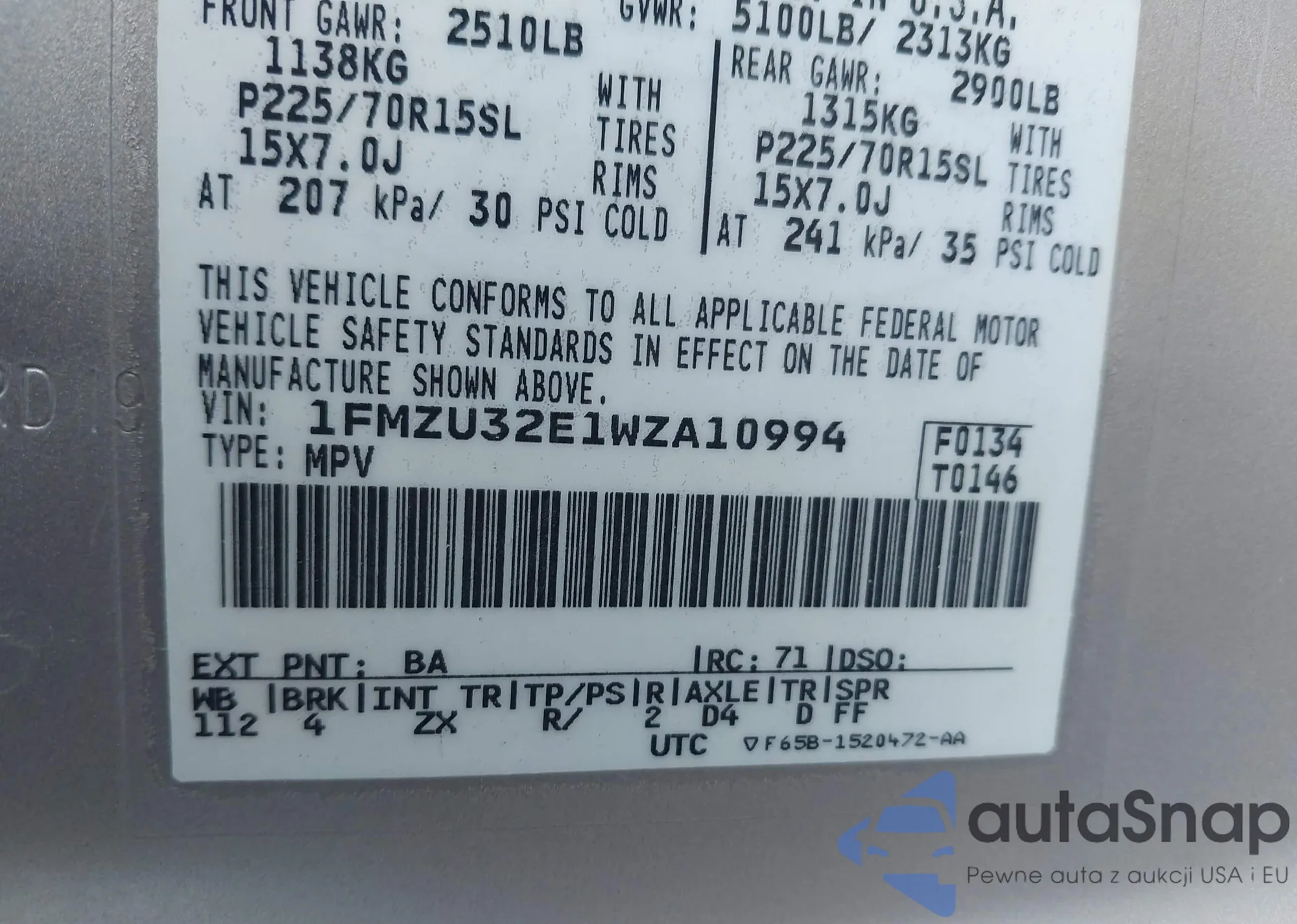 • VIN 1FMZU32E1WZA10994