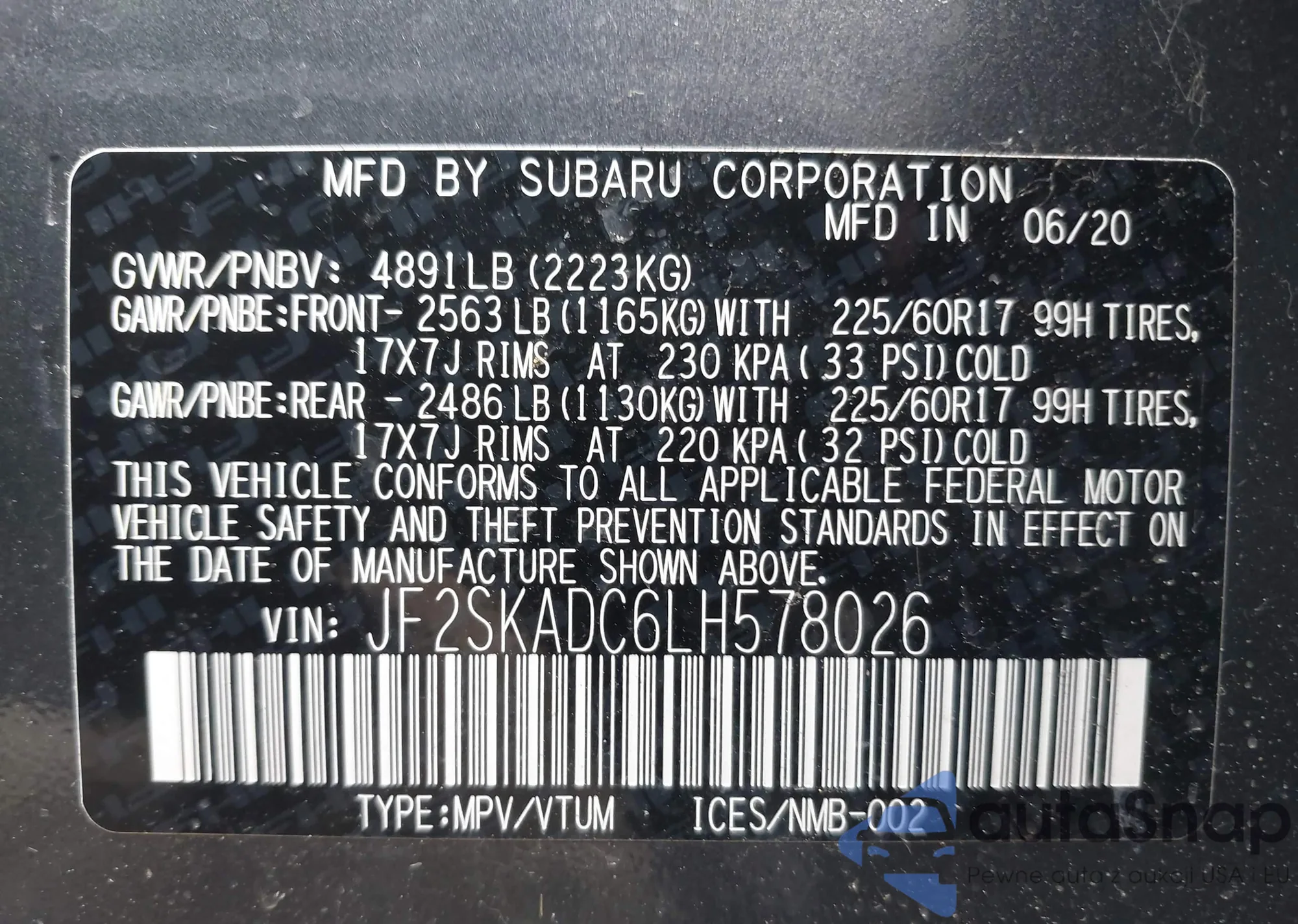 LOT: 40889784 VIN: JF2SKADC6LH578026