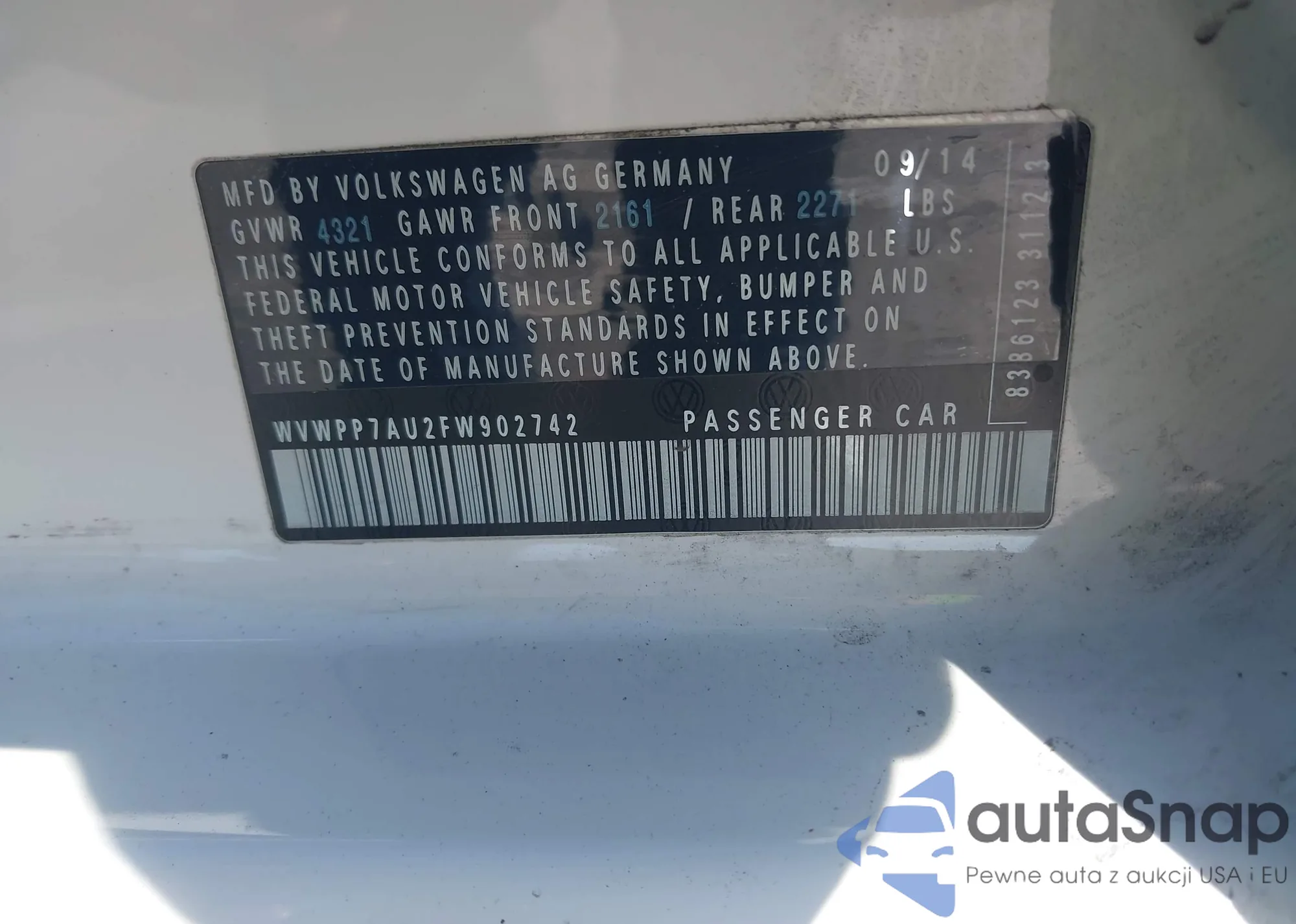 LOT: 41119368 VIN: WVWPP7AU2FW902742