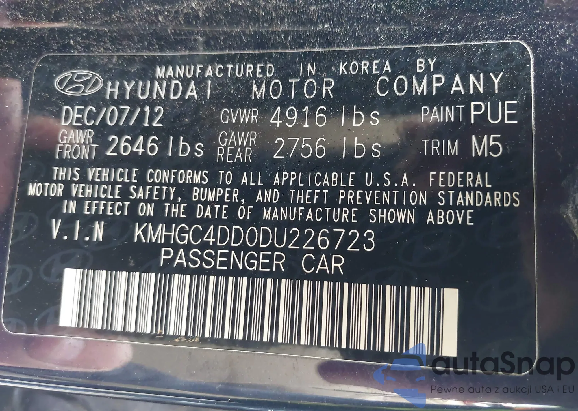 LOT: 40893213 VIN: KMHGC4DD0DU226723