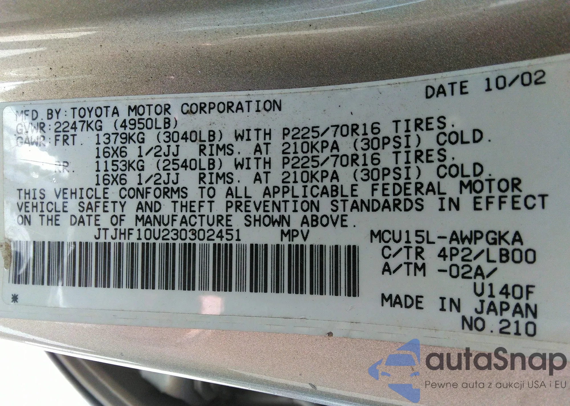 LOT: 37017411 VIN: JTJHF10U230302451