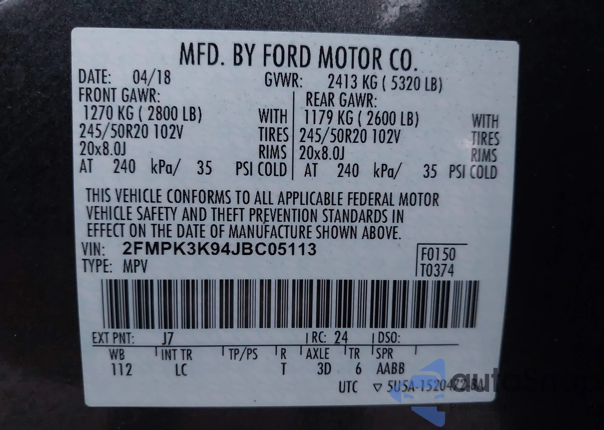 LOT: 40711150 VIN: 2FMPK3K94JBC05113