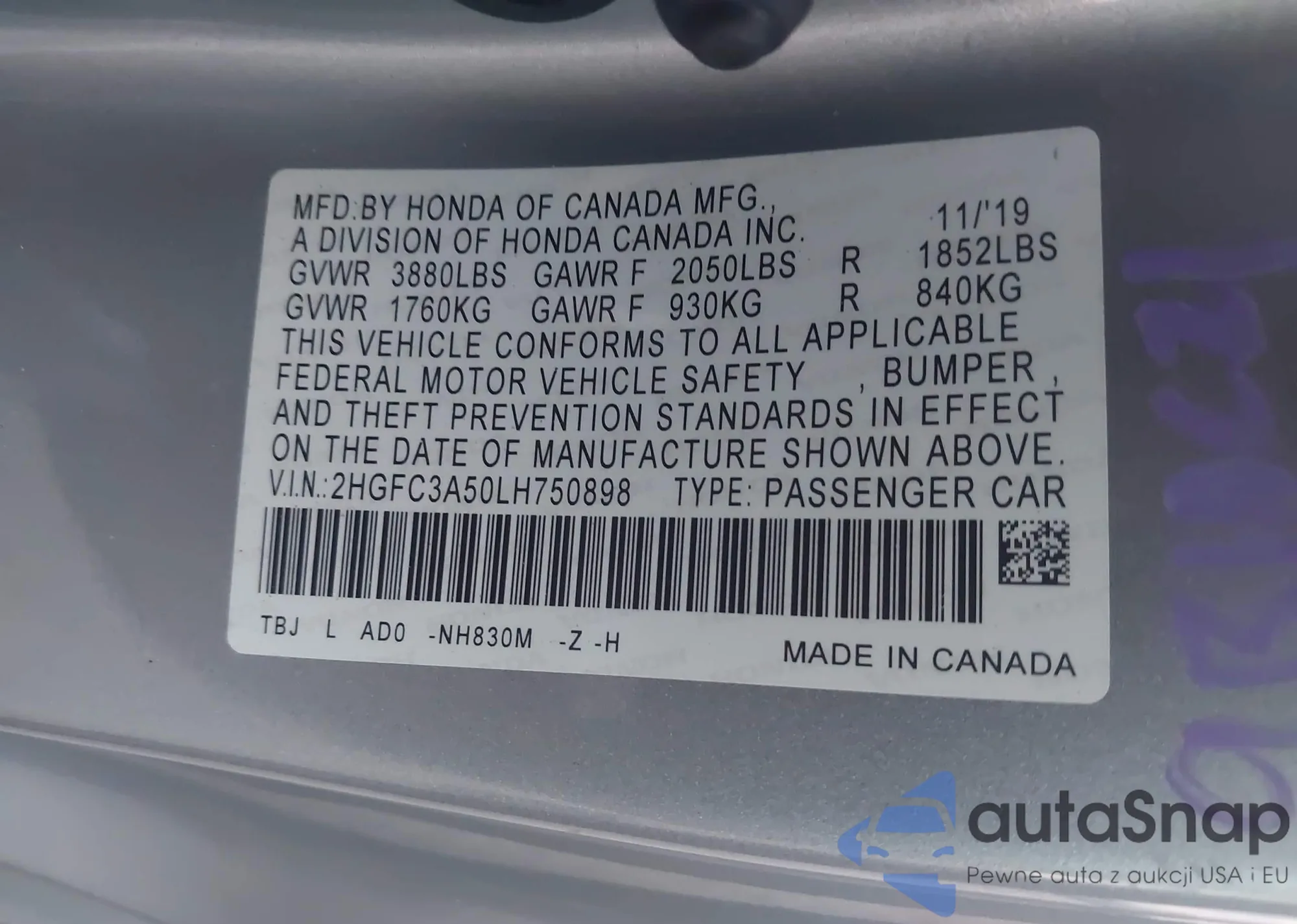 • VIN 2HGFC3A50LH750898