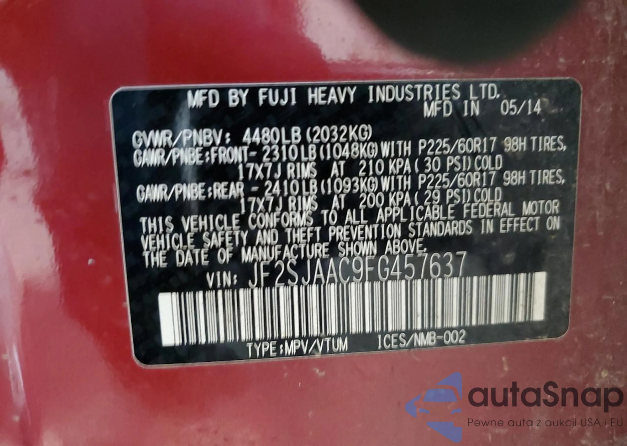 LOT: 85459604 VIN: JF2SJAAC9FG457637