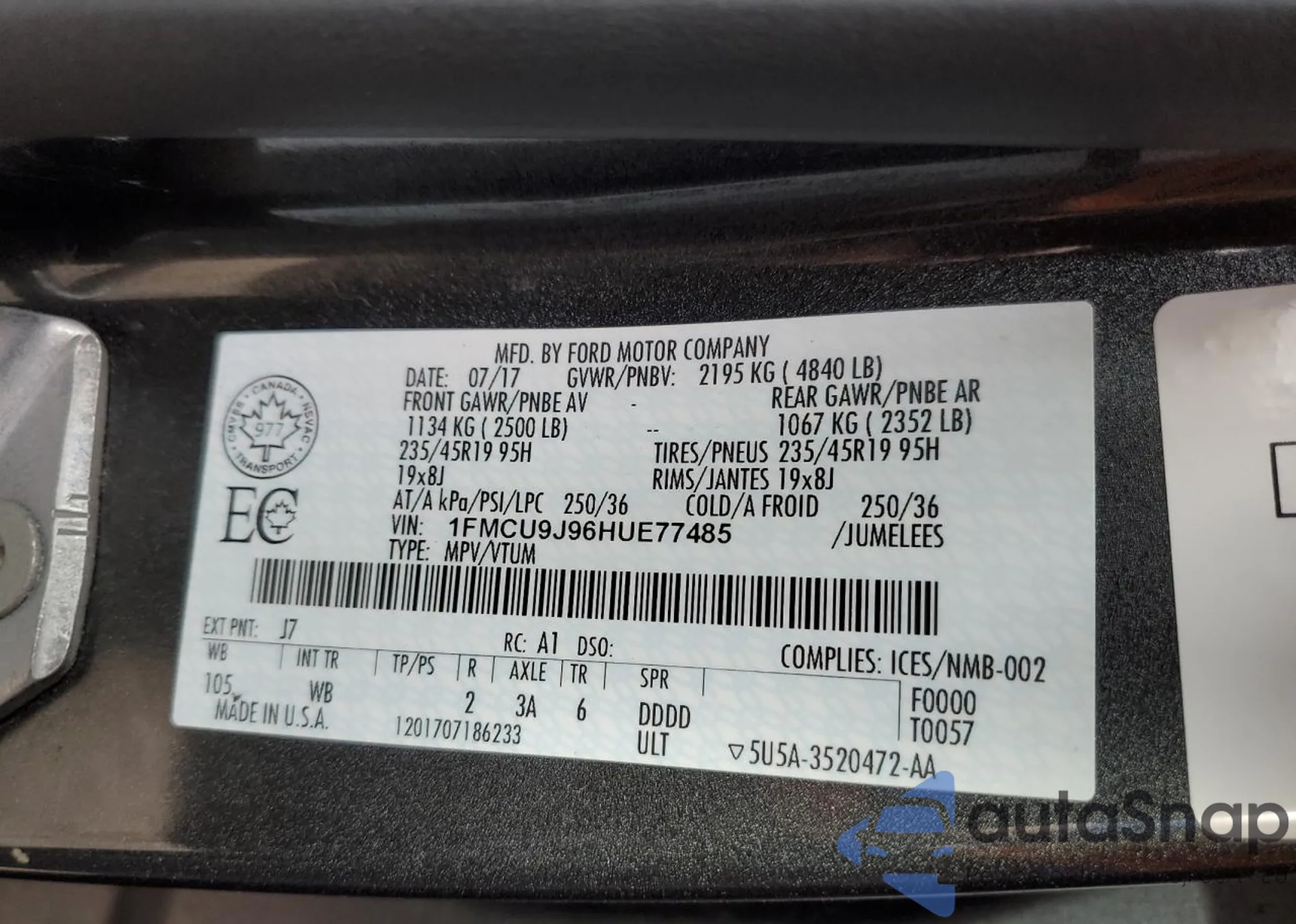 LOT: 79866734 VIN: 1FMCU9J96HUE77485