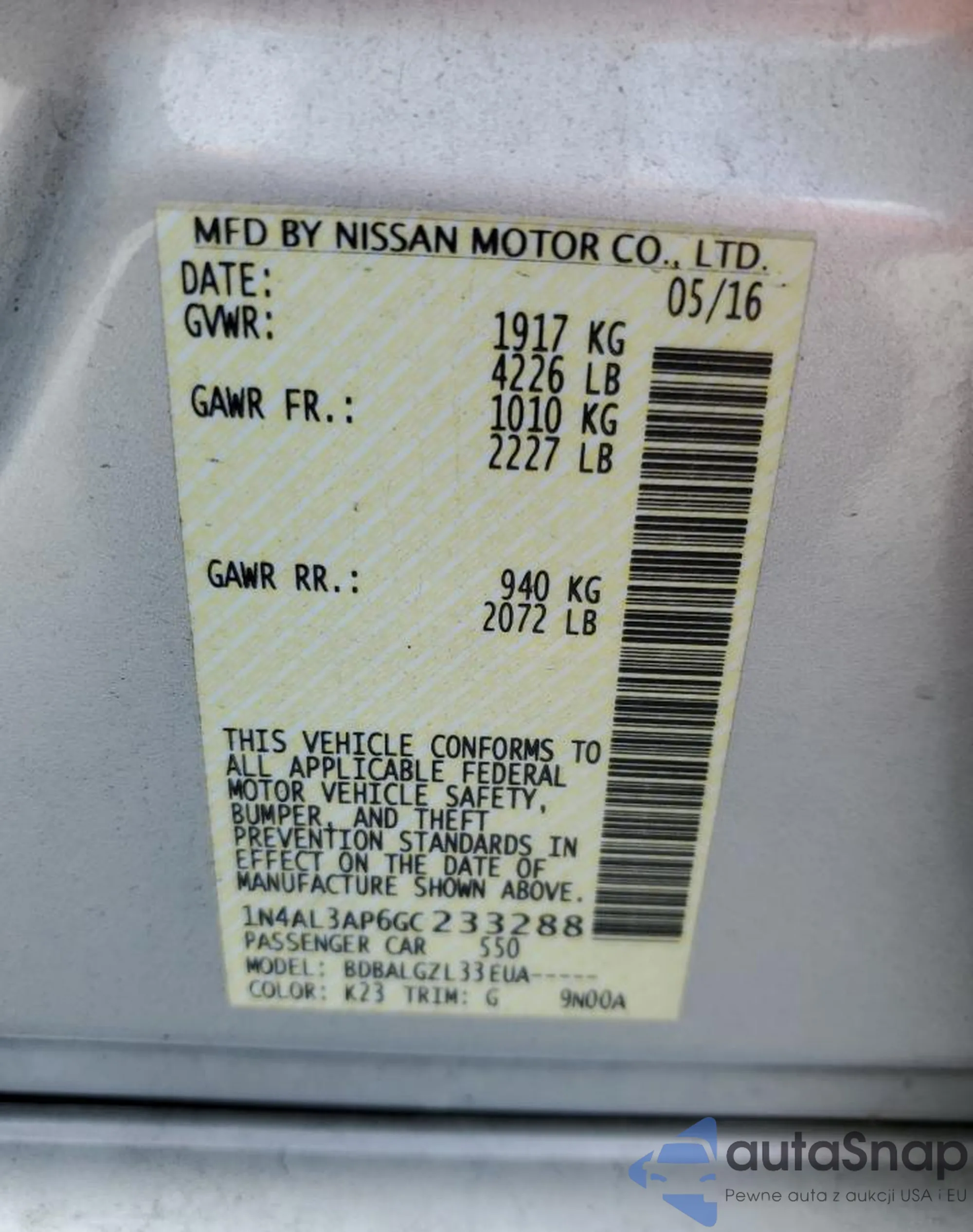 LOT: 59680604 VIN: 1N4AL3AP6GC233288