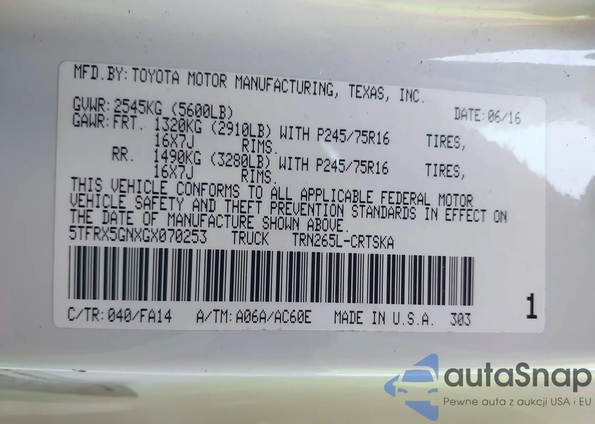 LOT: 40460929 VIN: 5TFUY5F14MX045561