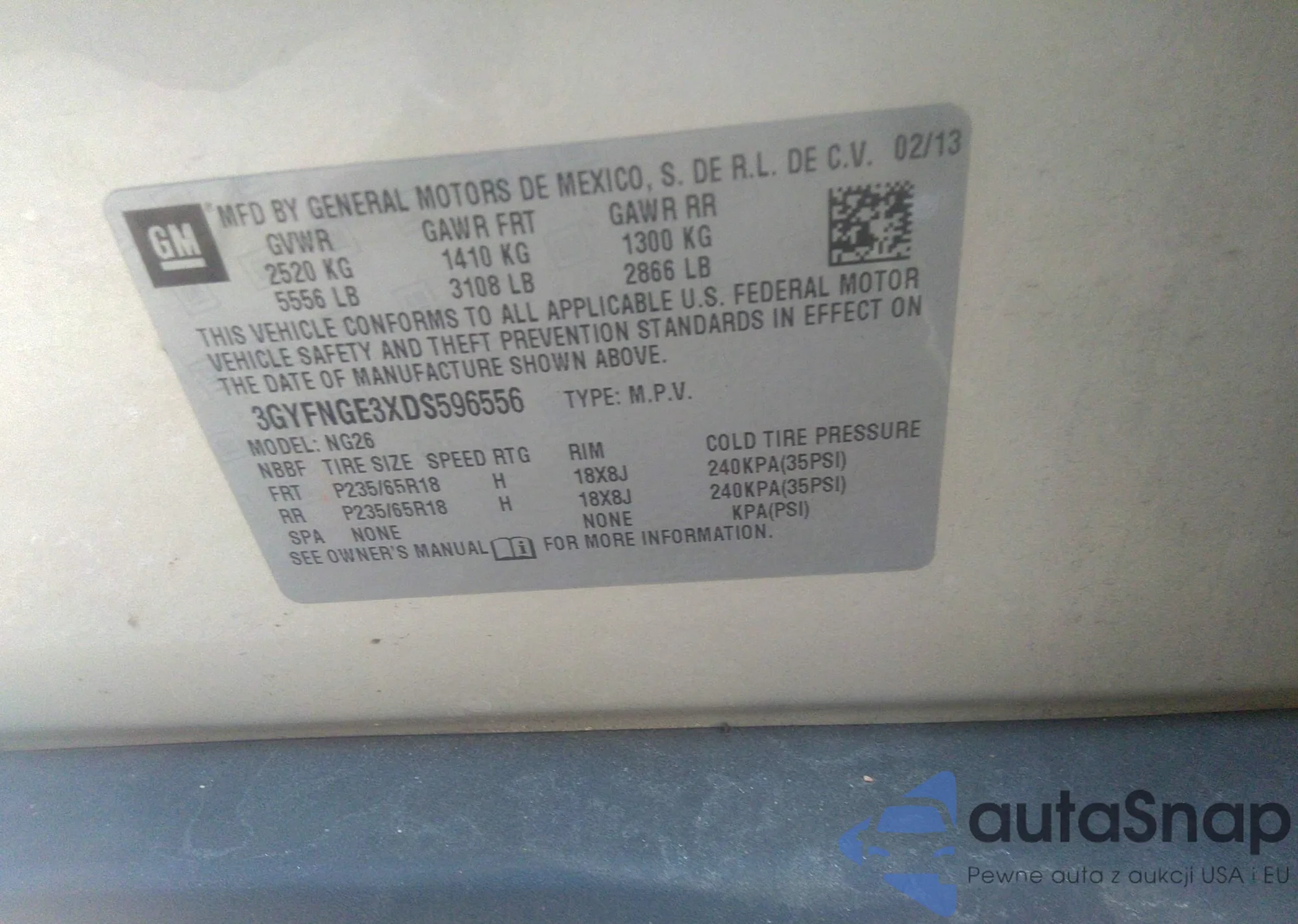 LOT: 41307005 VIN: 3GYFNGE3XDS596556