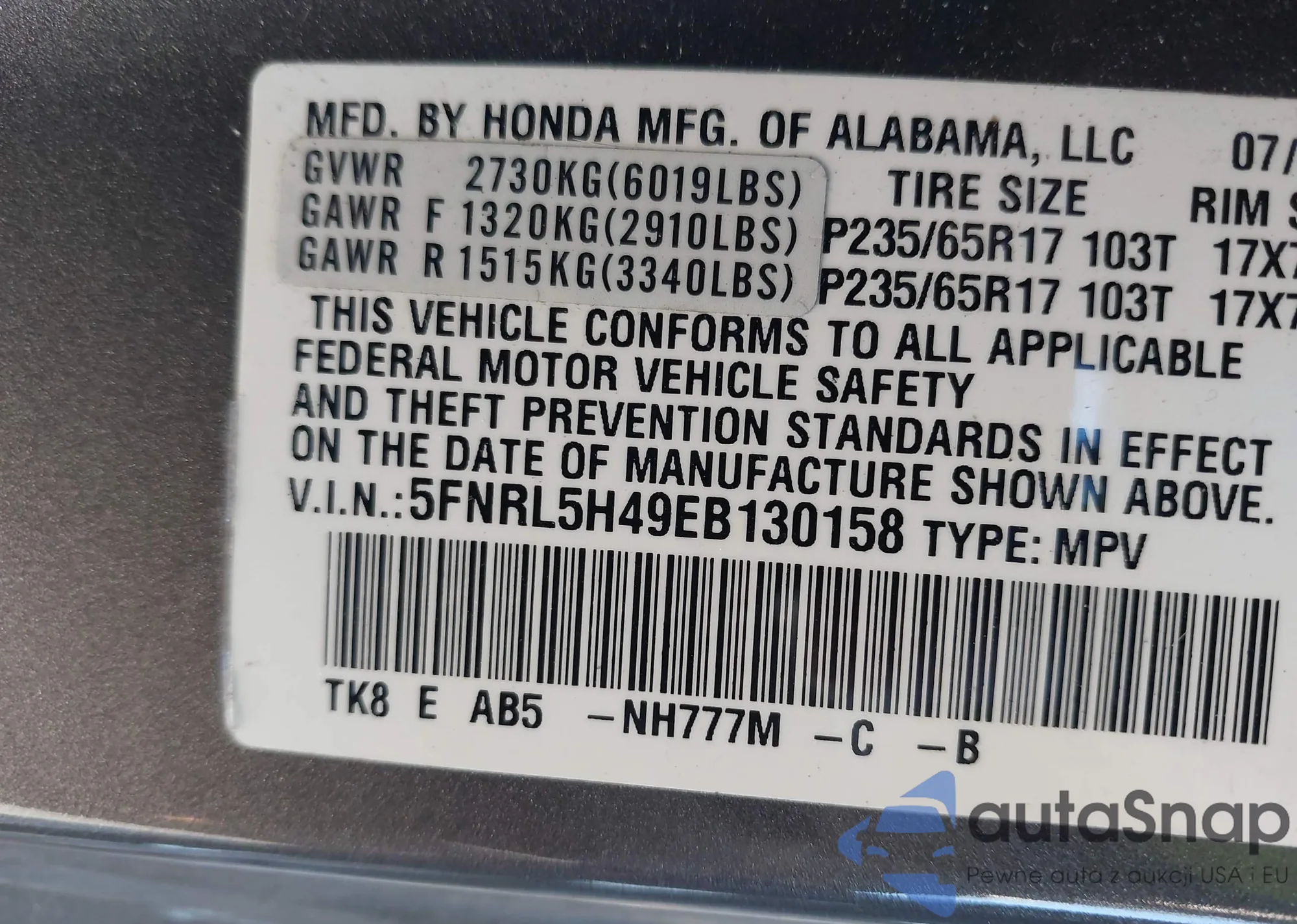 • VIN 5FNRL5H49EB130158