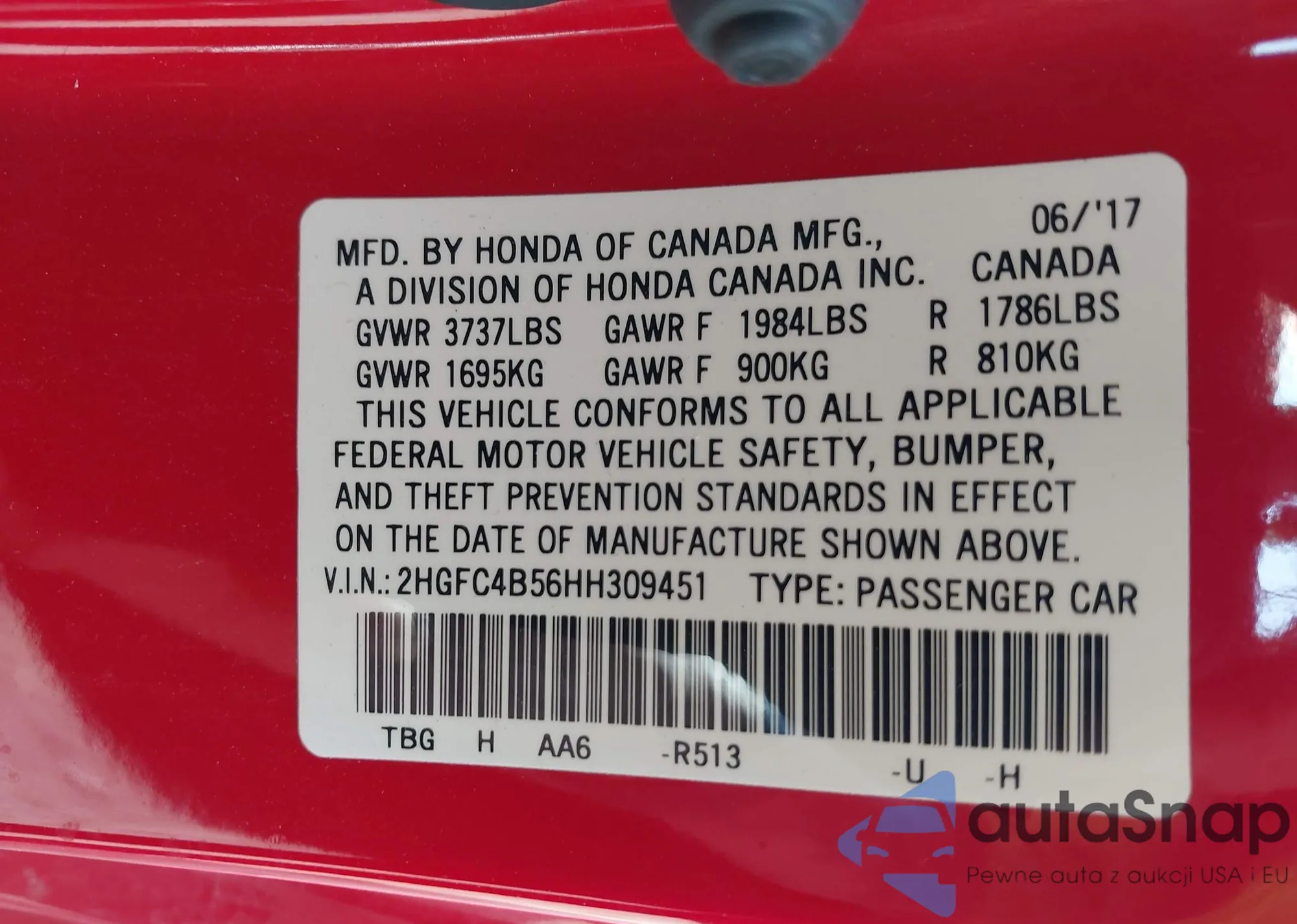 LOT: 40209451 VIN: 2HGFC4B56HH309451