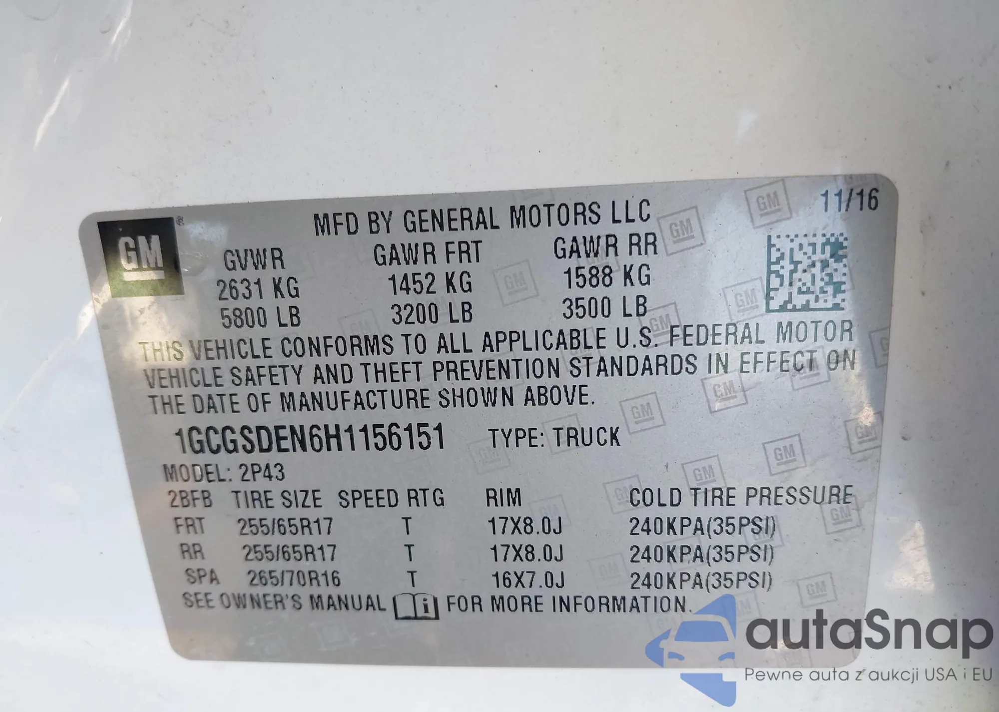 • VIN 1GCGSDEN6H1156151