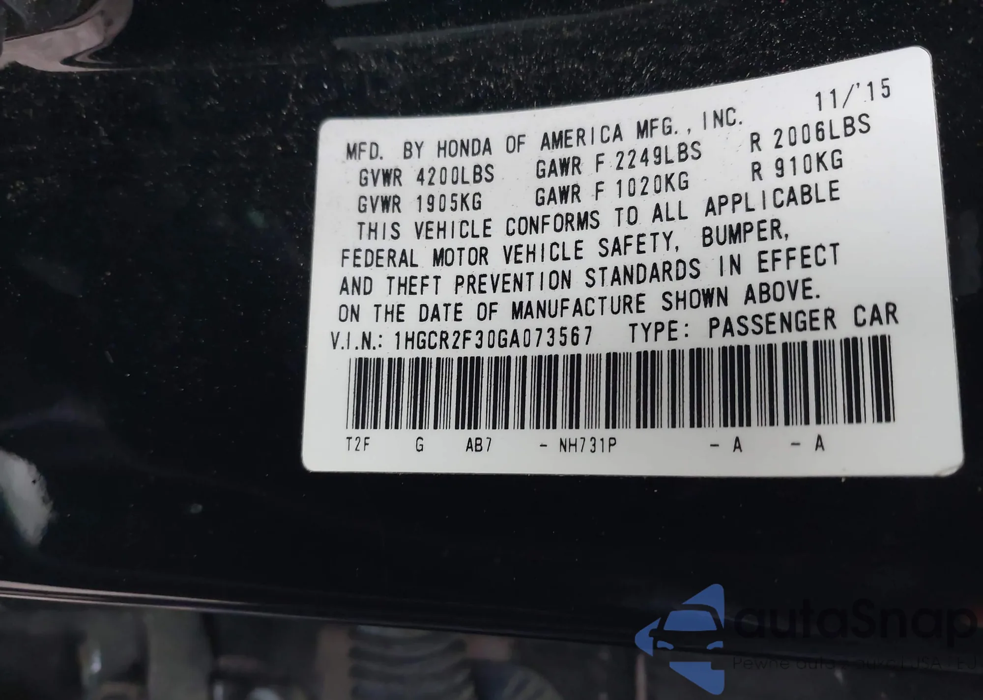 • VIN 1HGCR2F30GA073567