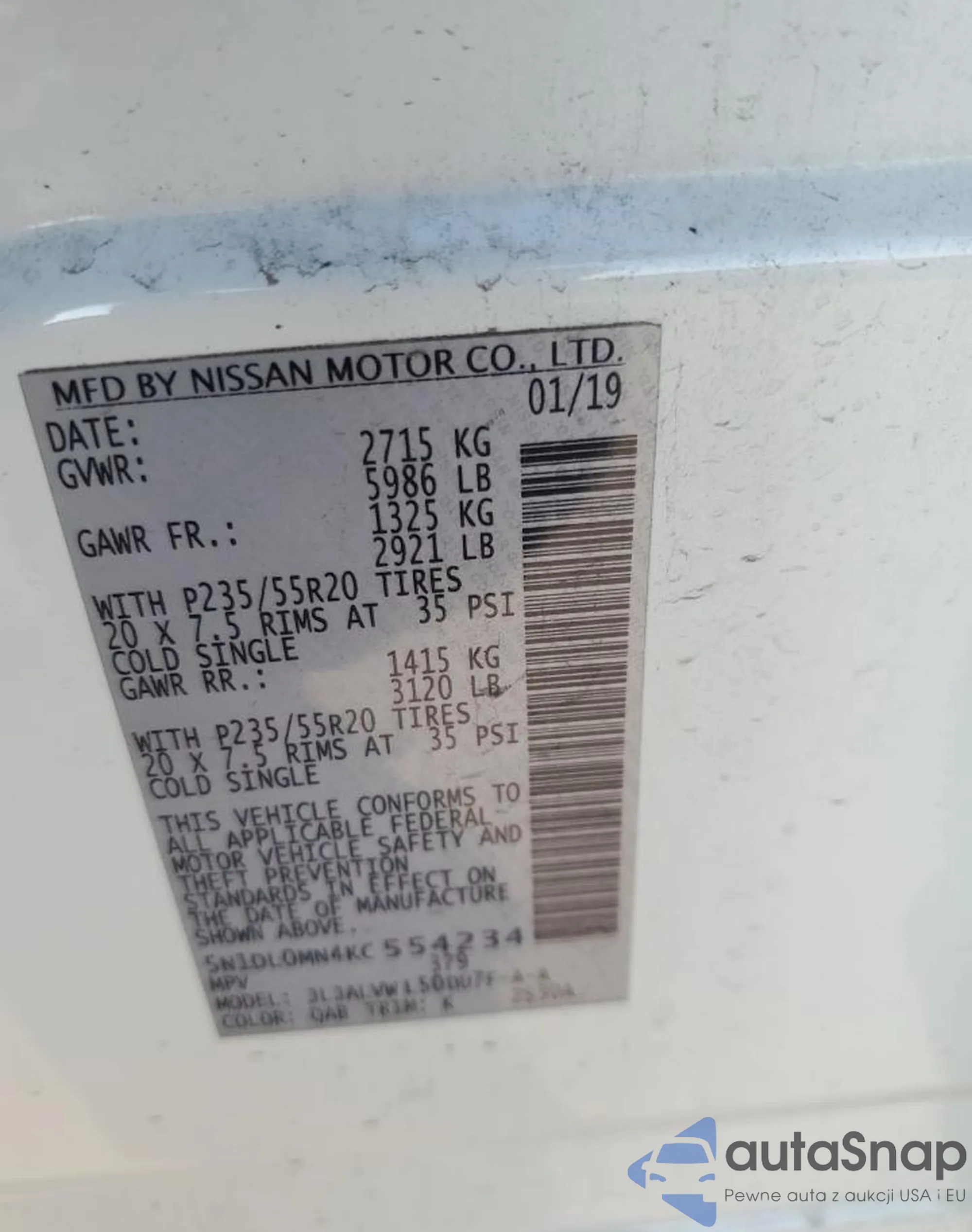 • VIN 5N1DL0MN4KC554234