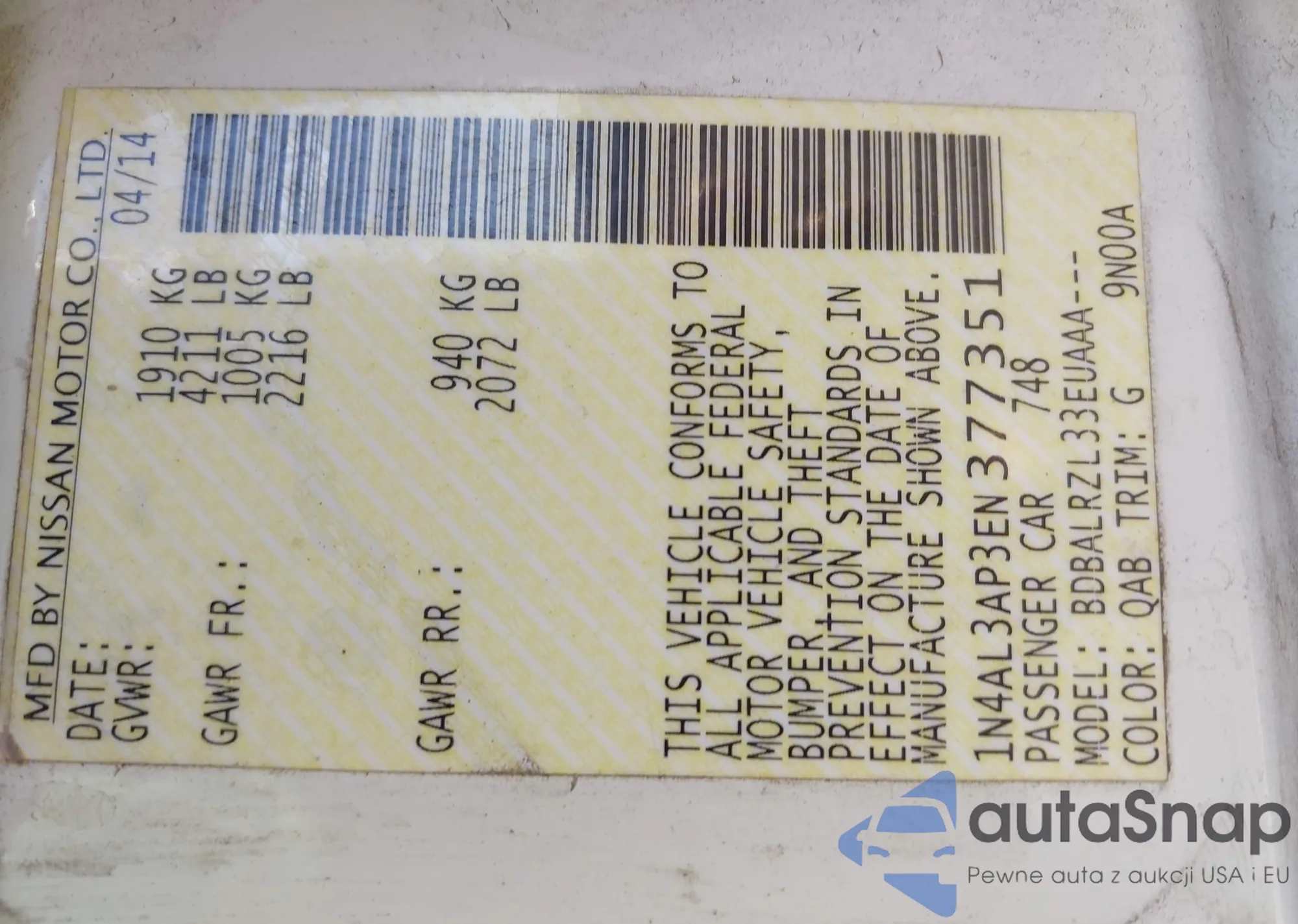 LOT: 41347836 VIN: 1N4AL3AP3EN377351