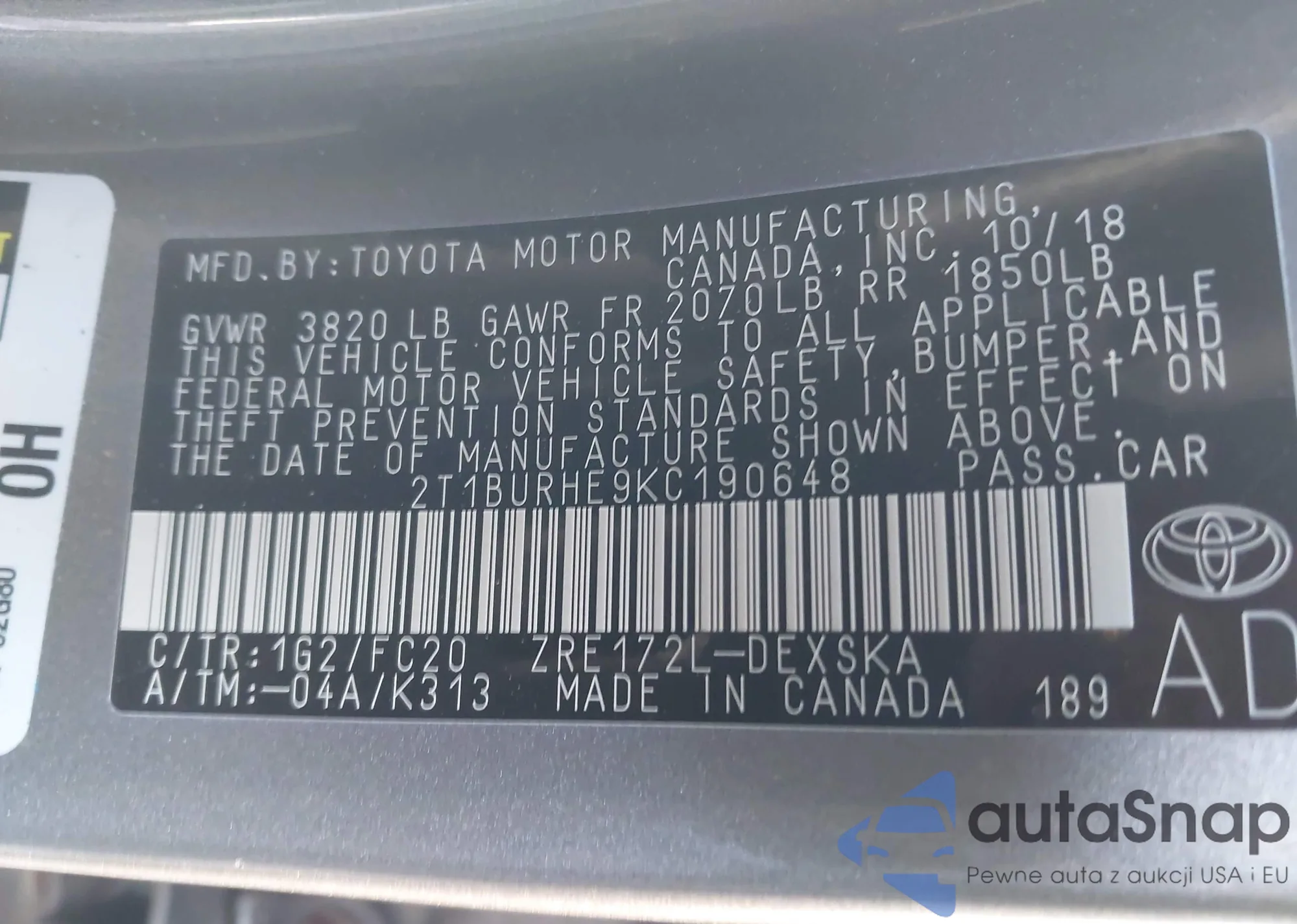 LOT: 38160867 VIN: 2T1BURHE9KC190648