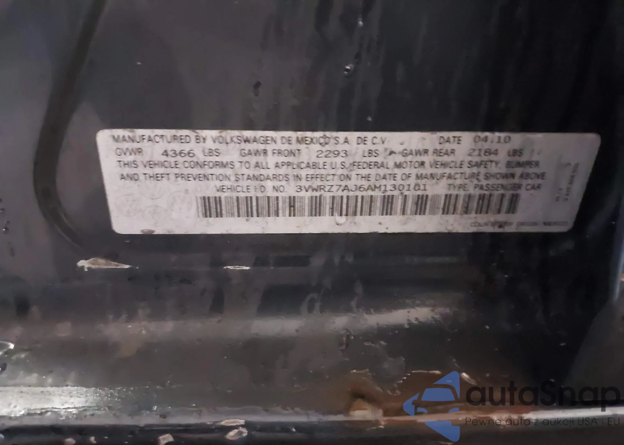 • VIN 3VWRZ7AJ6AM130101