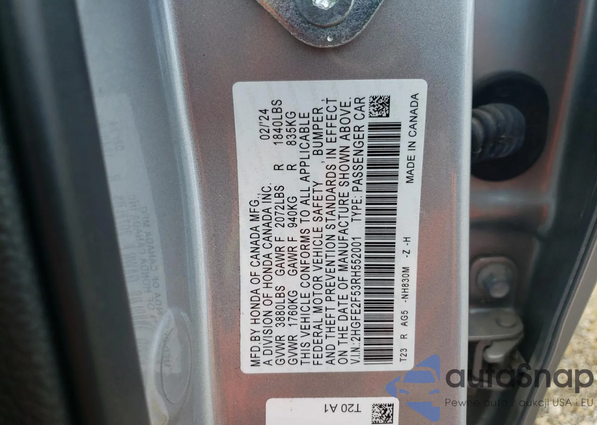 LOT: 82917024 VIN: 2HGFE2F53RH552001