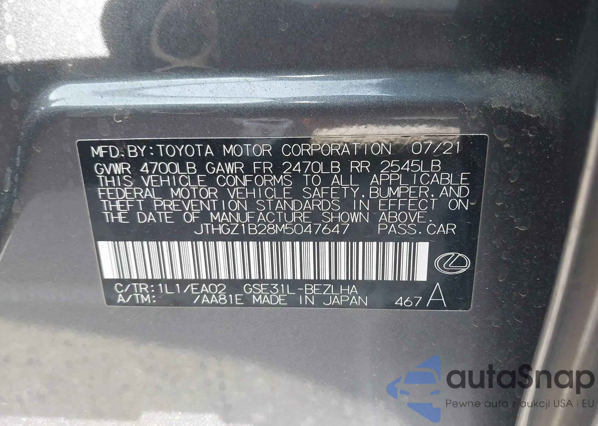• VIN JTHGZ1B28M5047647
