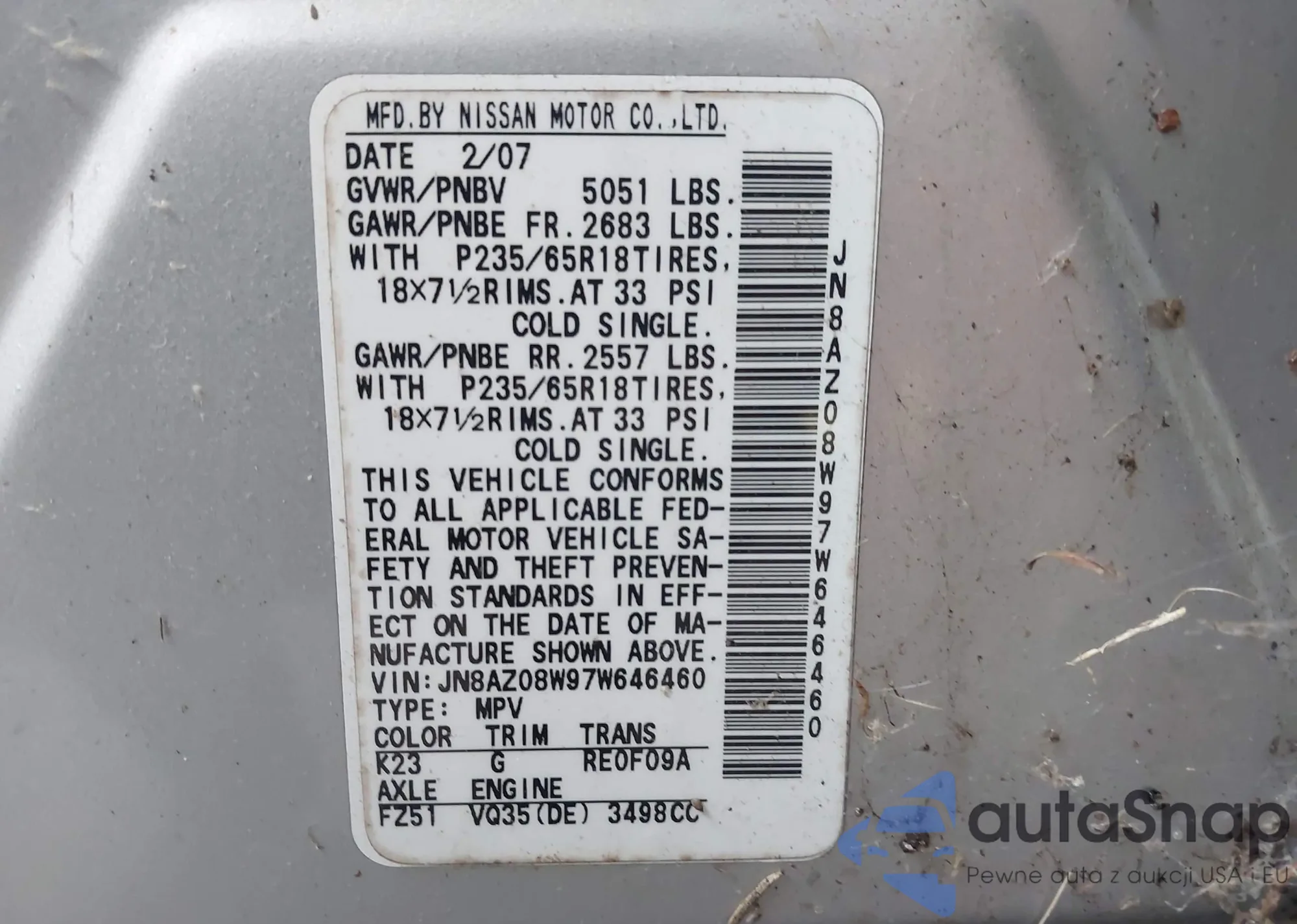 LOT: 40407295 VIN: JN8AZ08W97W646460