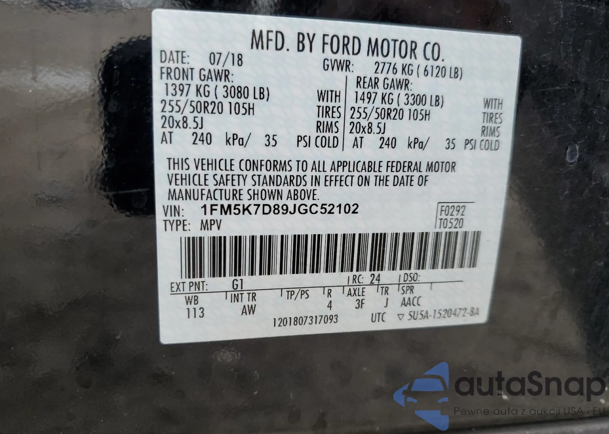 LOT: 41953375 VIN: 1FM5K7D89JGC52102
