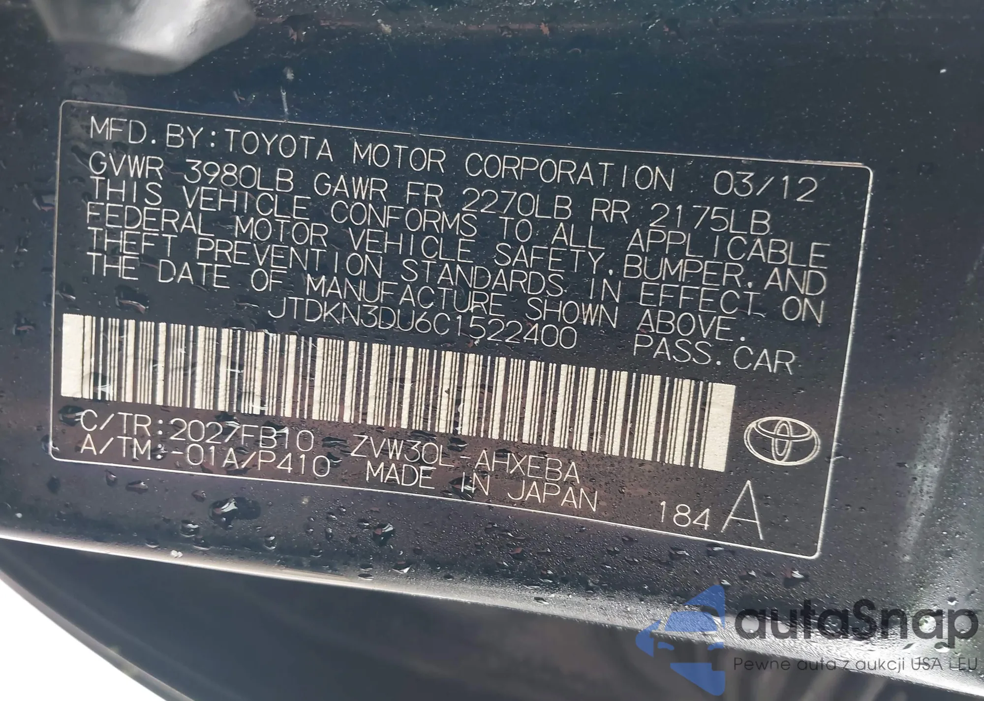 LOT: 40645558 VIN: WUAVACFX3J7902212