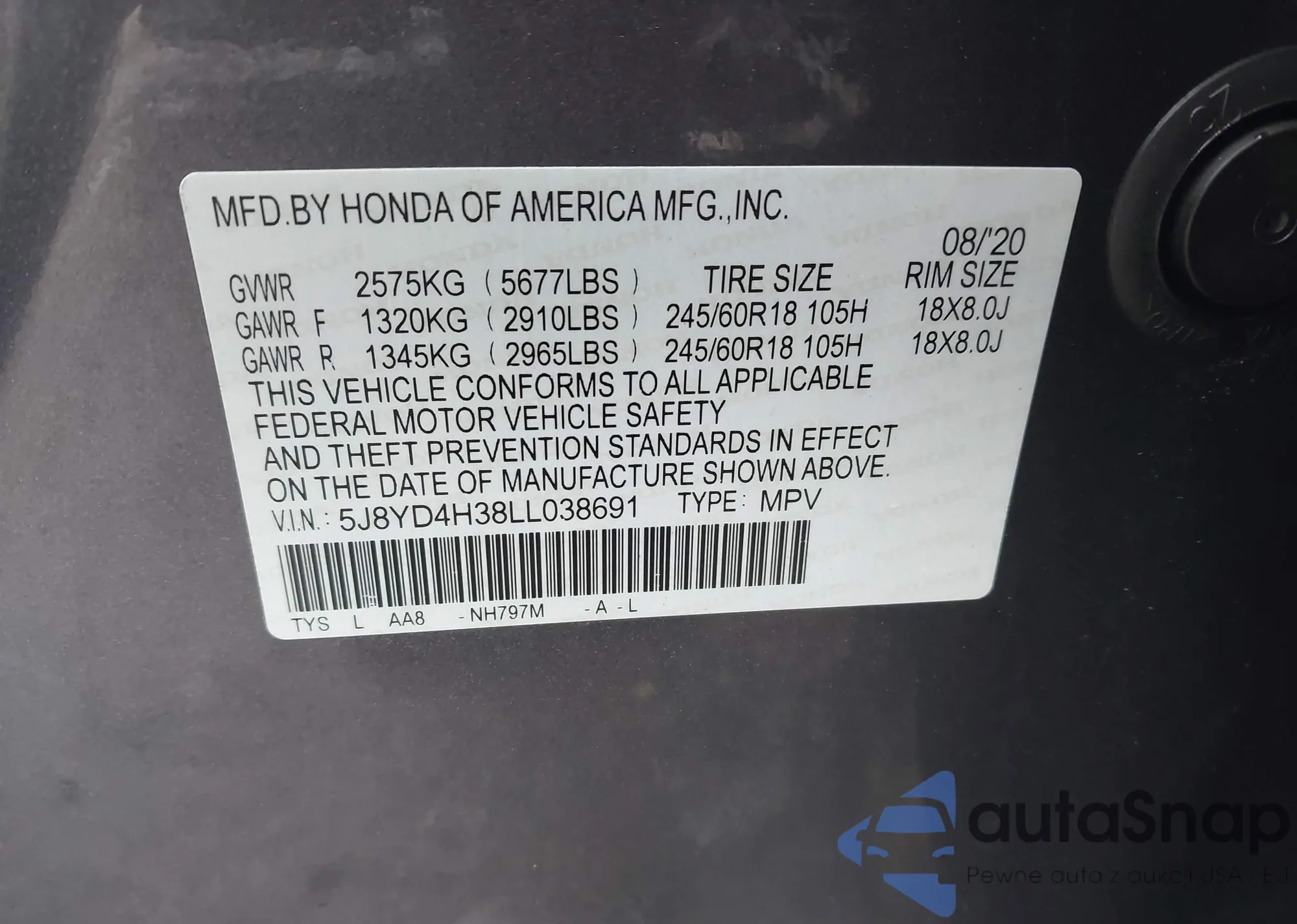 • VIN 5J8YD4H38LL038691