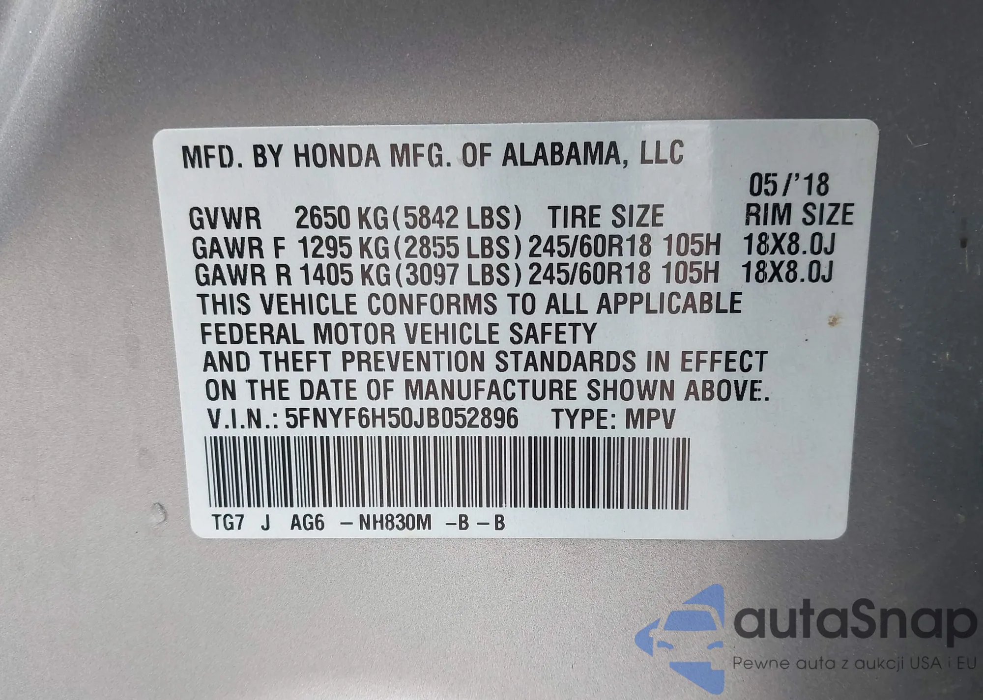 • VIN 5FNYF6H50JB052896